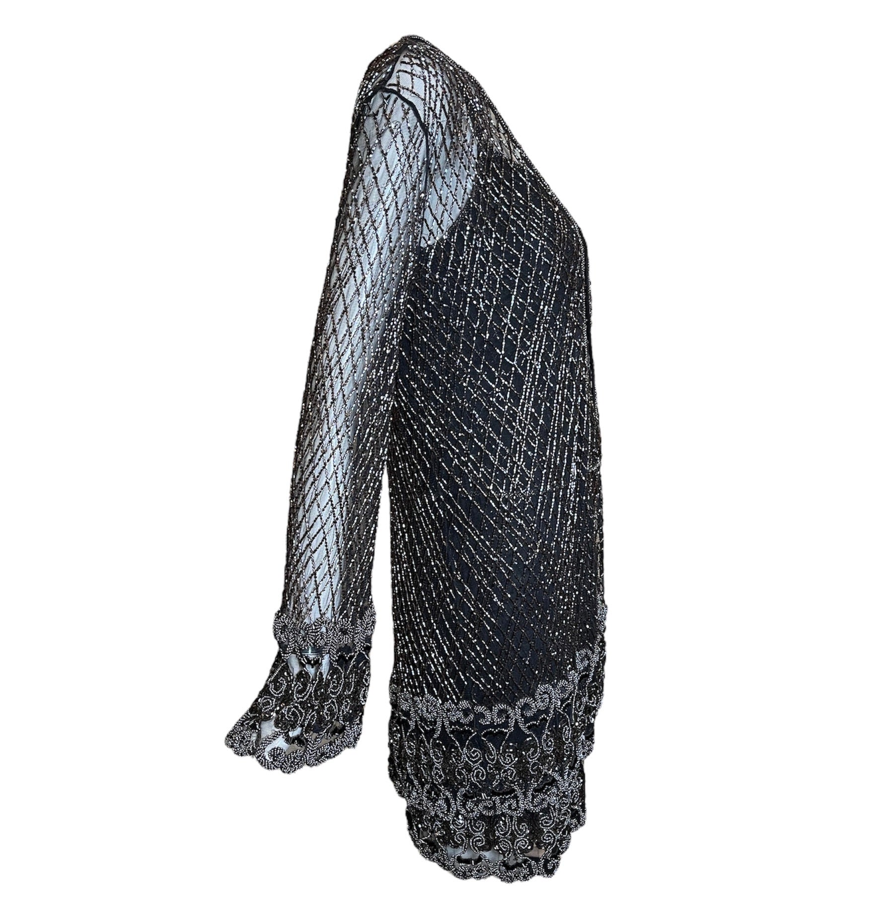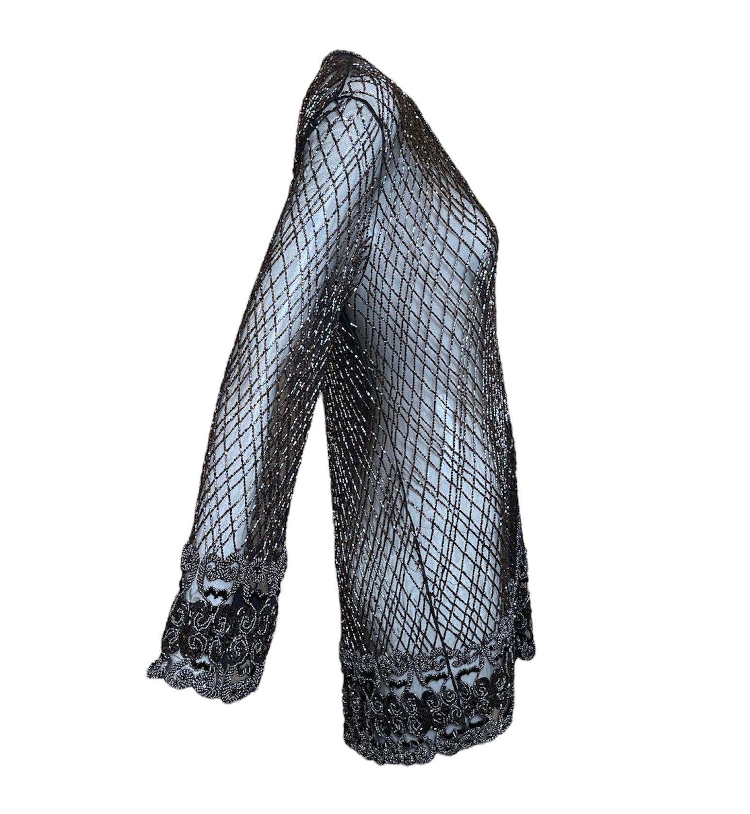 Overall very good condition with small spots of loose beads at points of stress such as the shoulder (cardigan) and side zipper (blouse). Beaded all over so missing beads are not so easy to spot.
