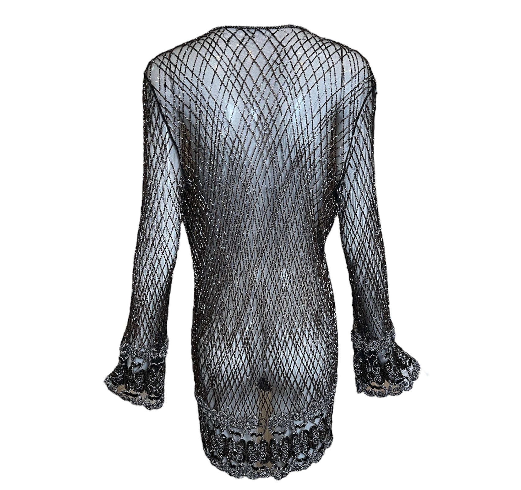 You'll outshine the midnight sky in this spectacular little evening ensemble by Badgley Mischka. This three-piece set is a rare early piece by the brand dating to around 1988-1990. The ensemble consists of a skirt, camisole, and long sleeve cardigan.