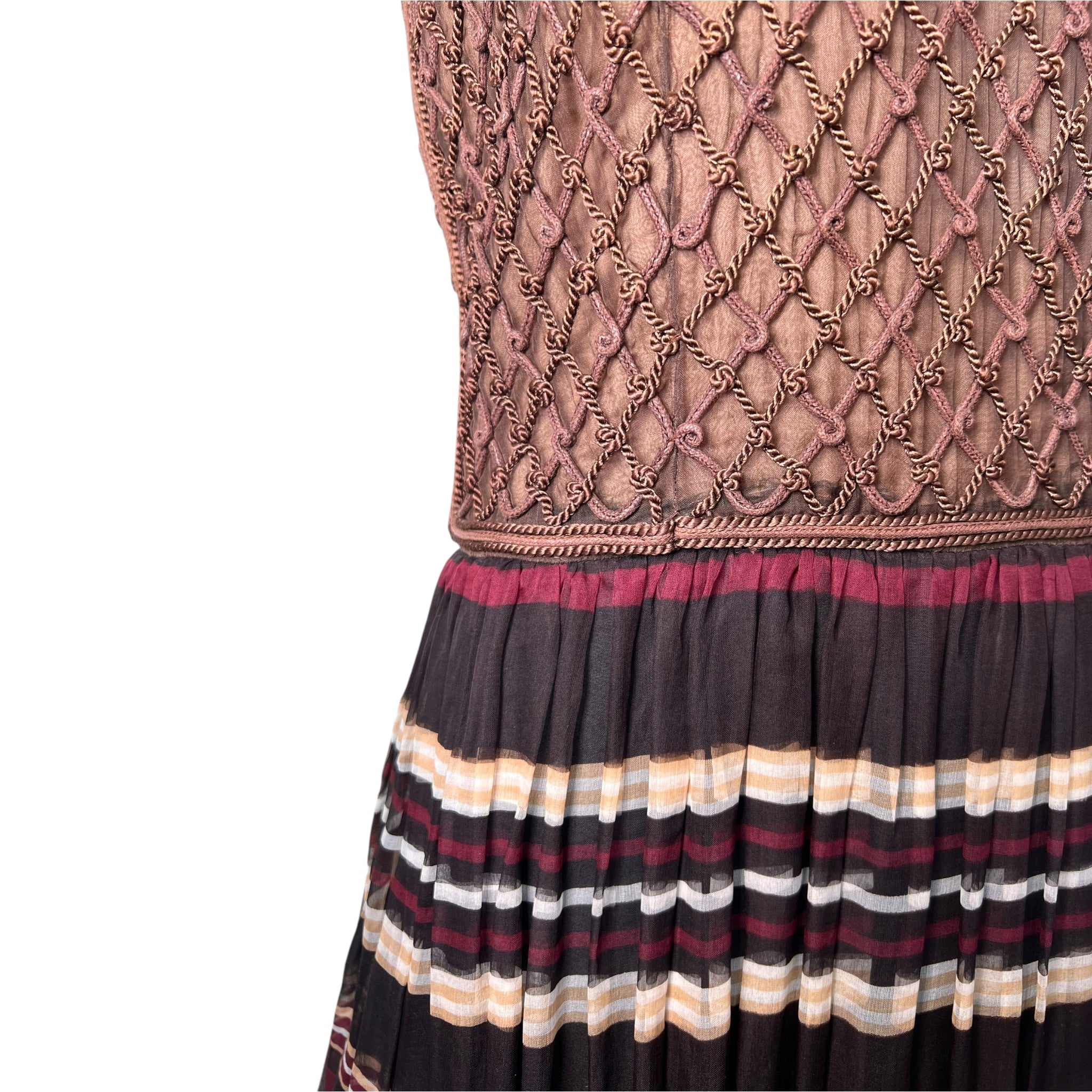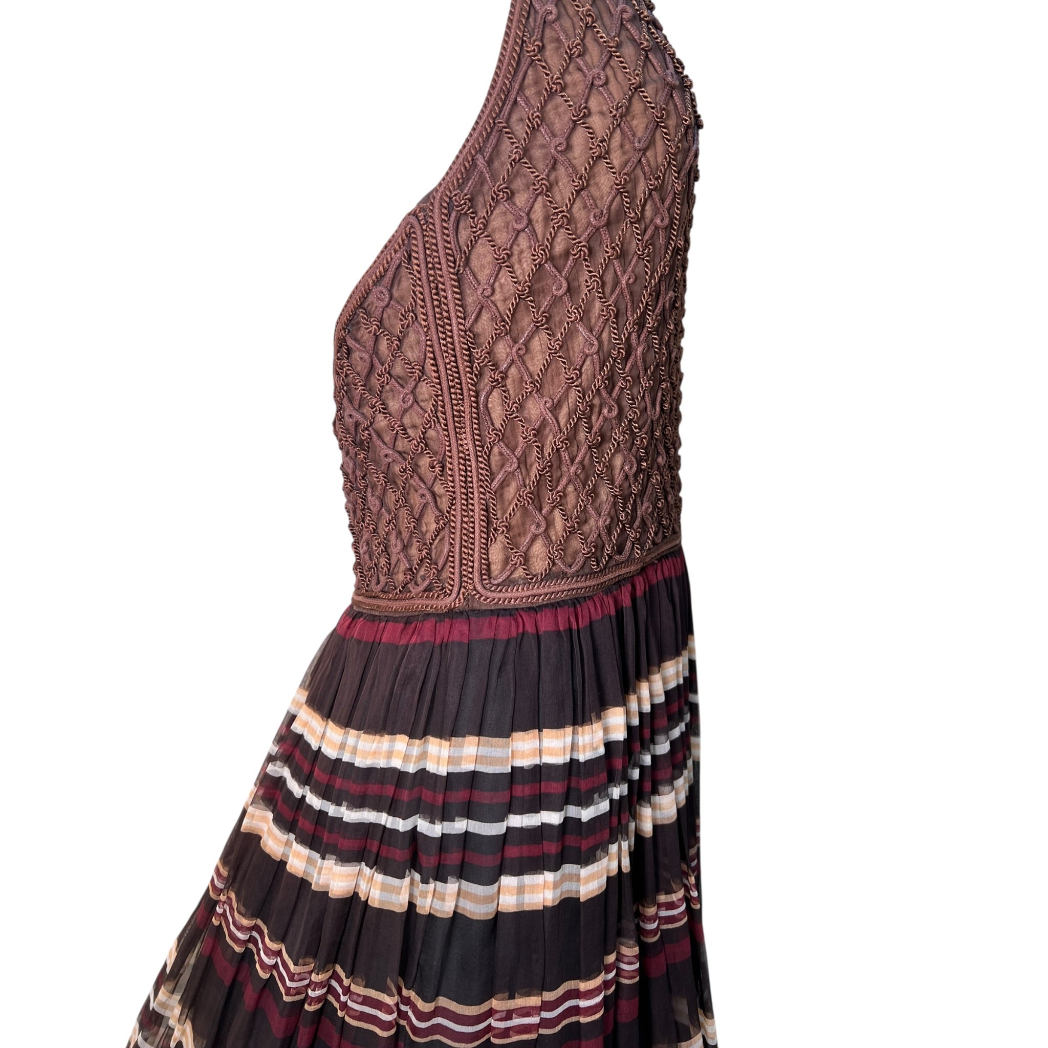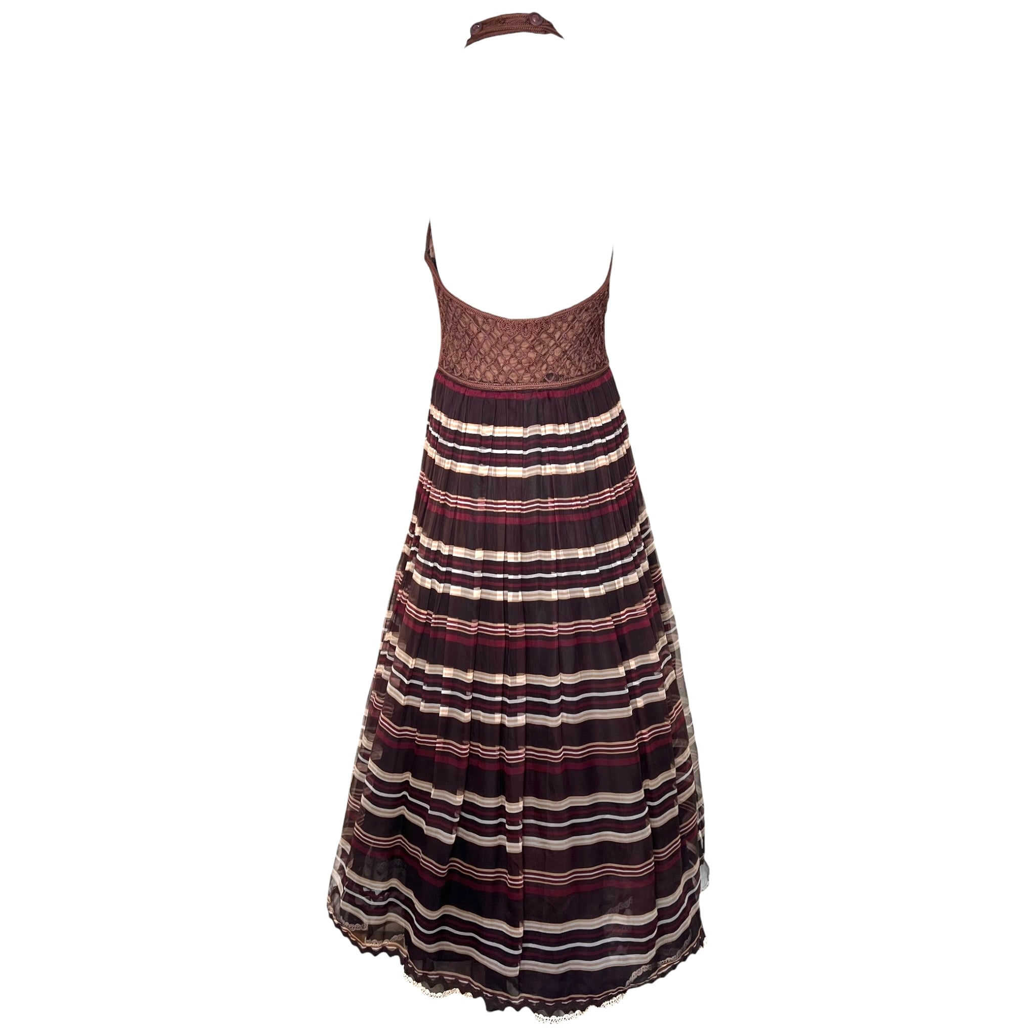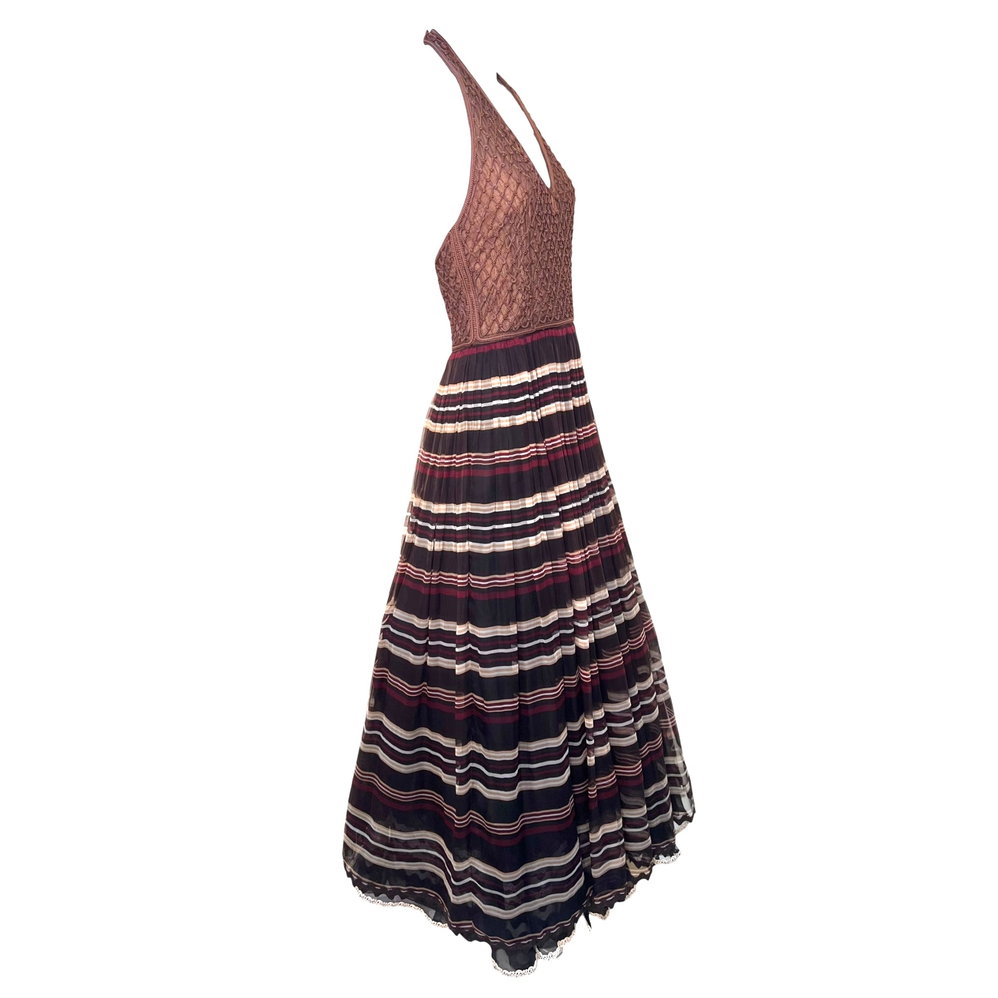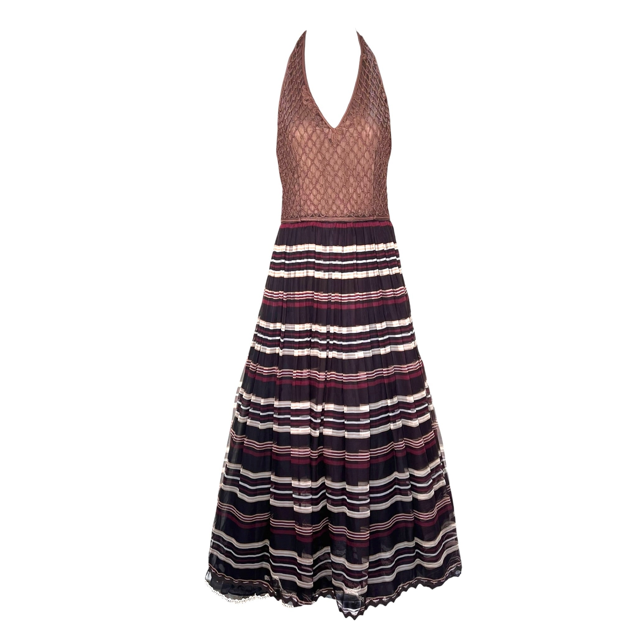 Christian Dior Boutique S/S 1994 Gianfranco Ferre Chocolate Brown Striped Macrame Halter Neck Gown