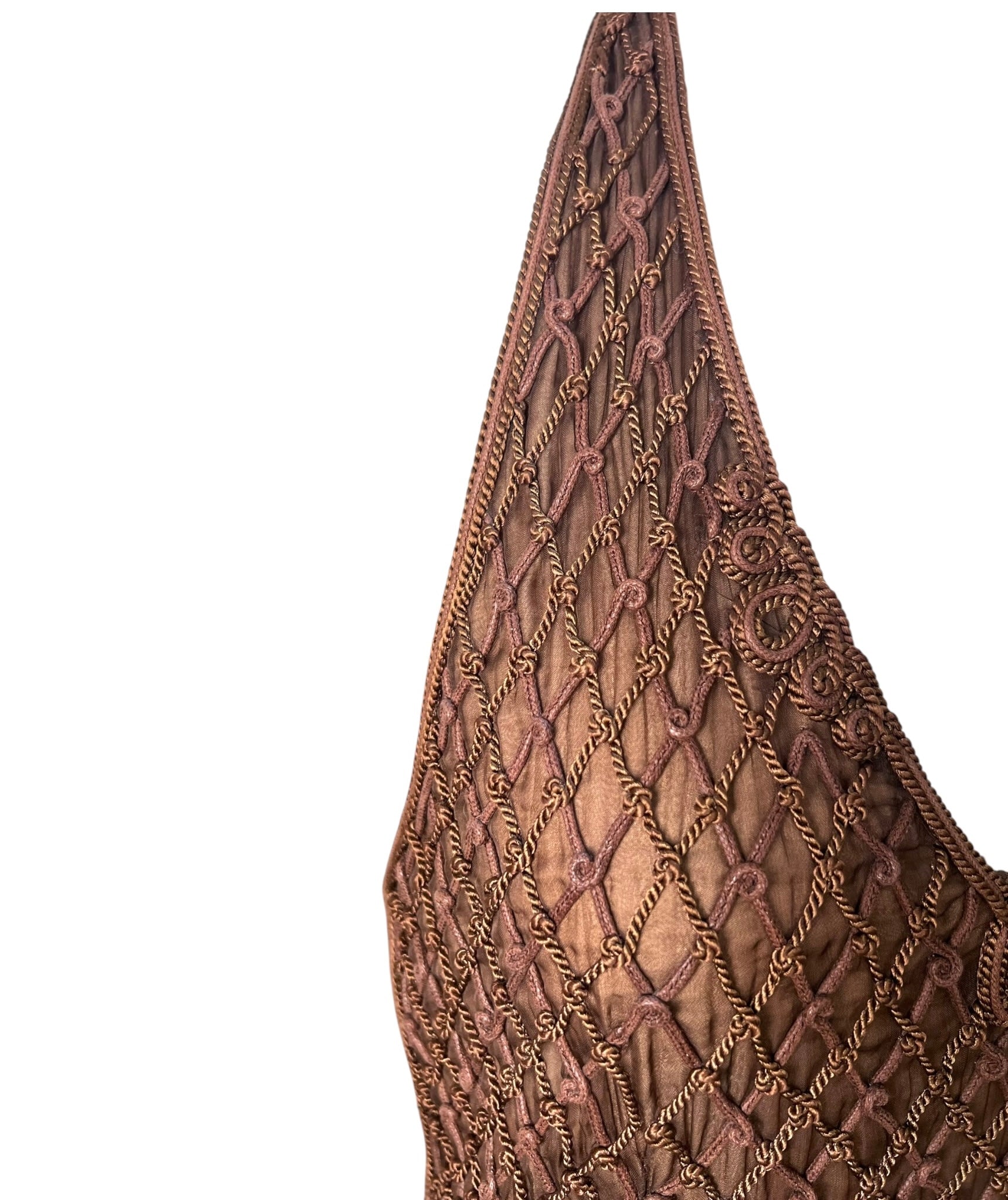 The bodice of the gown is composed of a chocolate brown macrame halter top lined in matching silk with a plunging neckline and an open back. The halter buttons closed at the nape of the neck. The full skirt is composed of four layers.