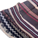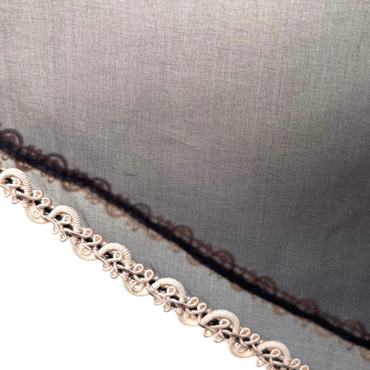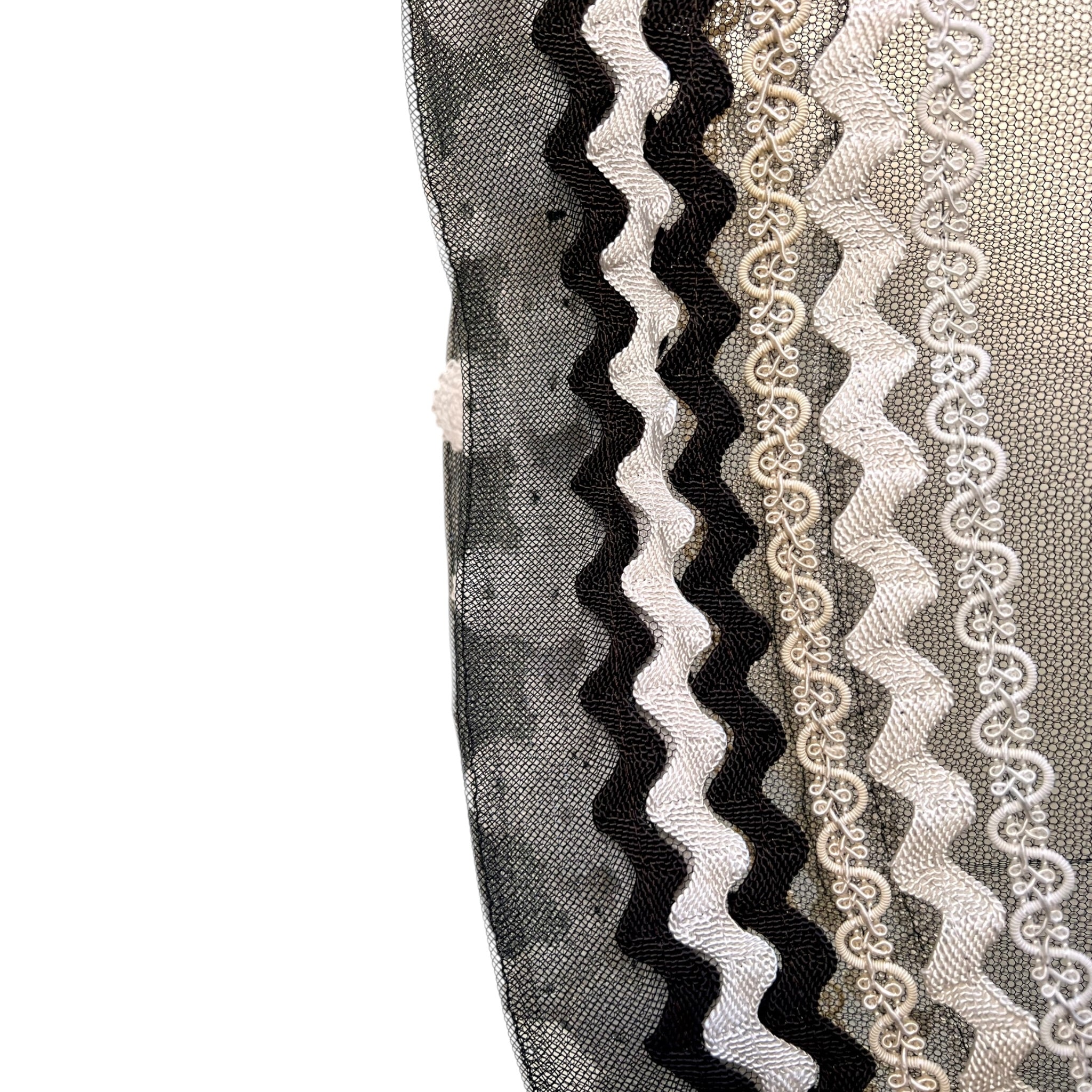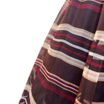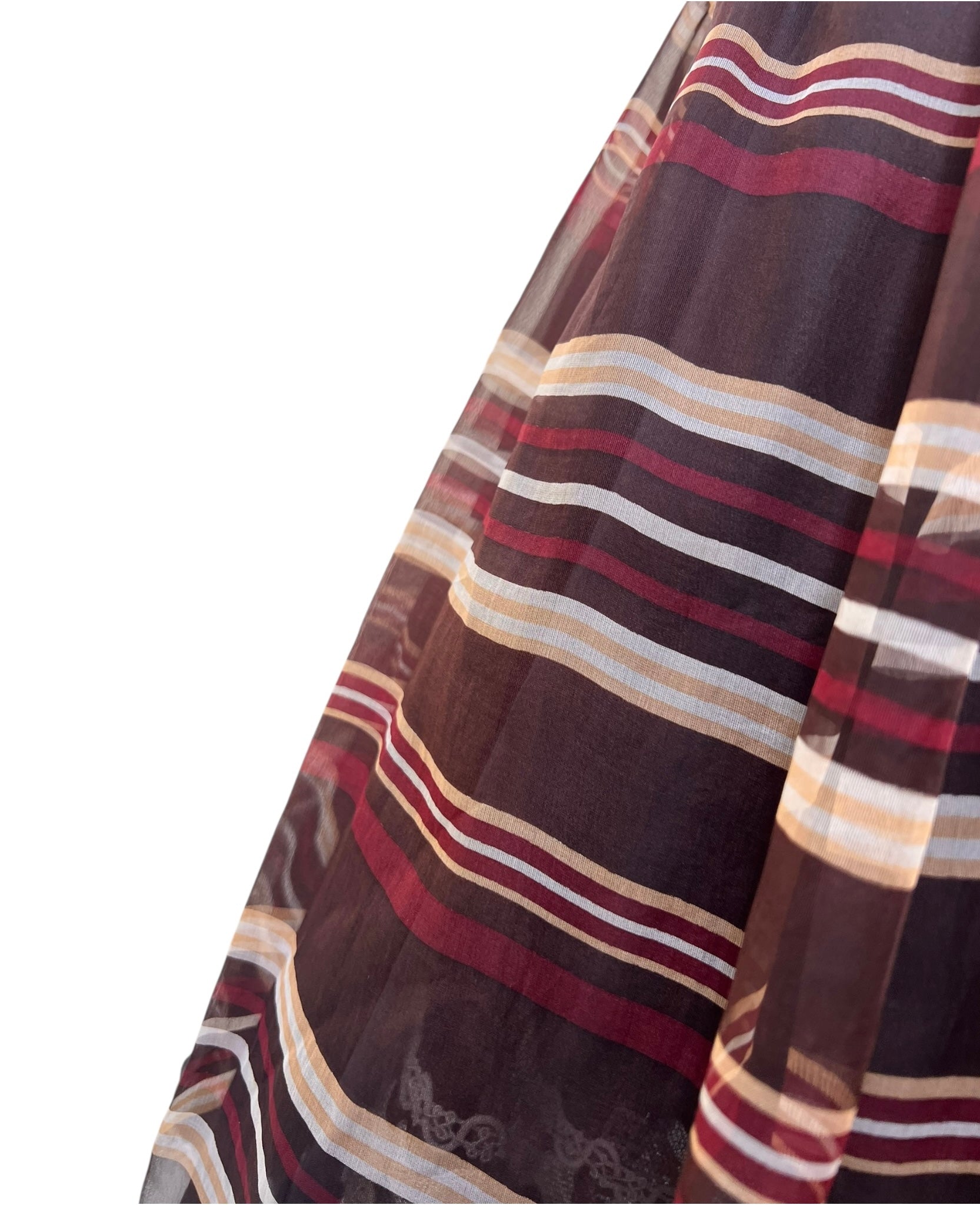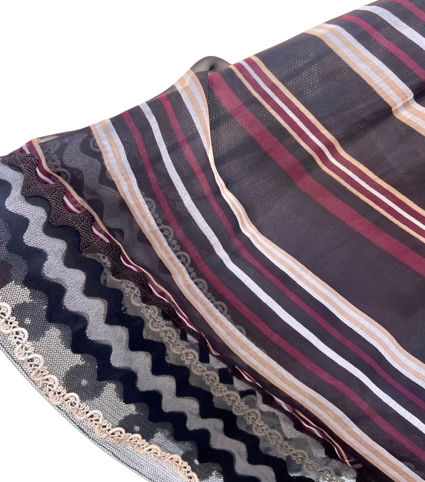 The outer skirt is a striped brown, cream, and burgundy sheer silk. The second layer is a sheer black silk with a cream macrame piping trim at the hem. The third is layer is a black net tulle petticoat with about 6" or cream appliquéd trim at the hem. The final interior petticoat is a classic, voluminous sheer black petticoat that hugs the hip and flares below the rear.