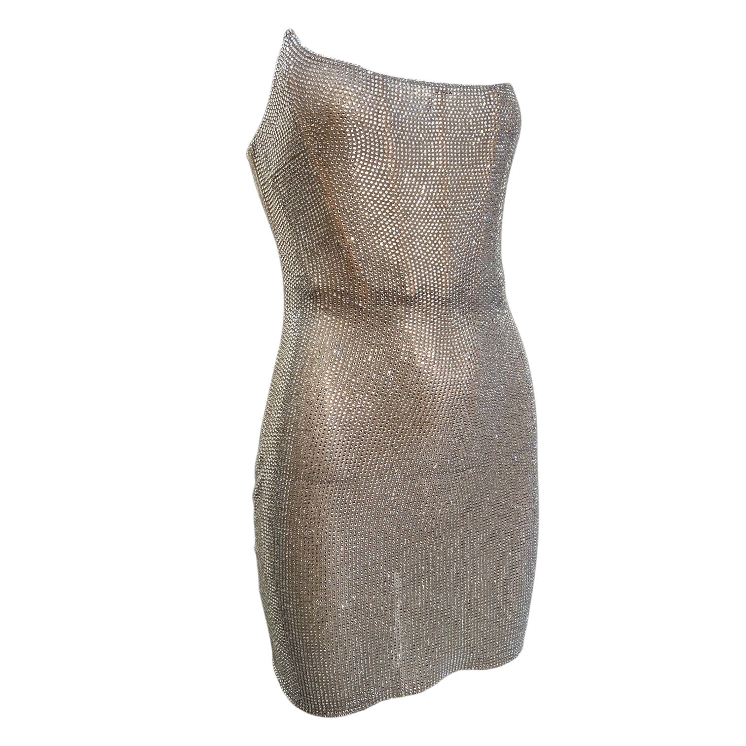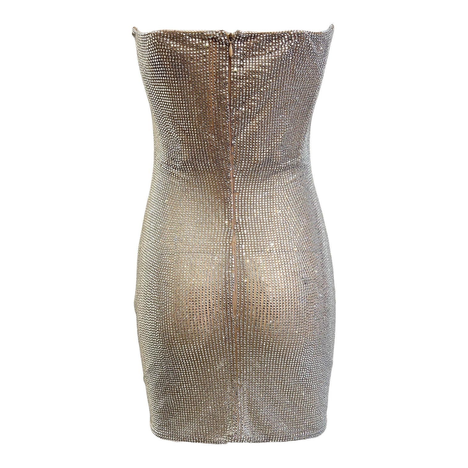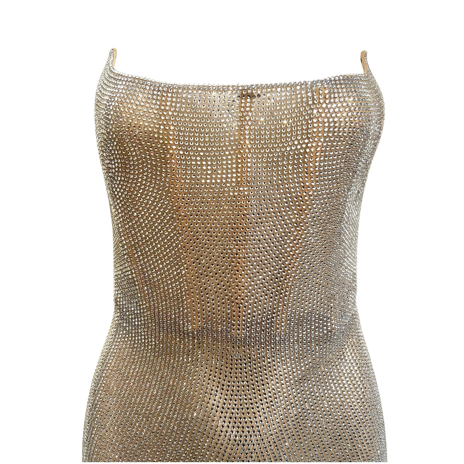 Fully embellished with sparkling crystals, this Giuseppe Di Morabito strapless mini dress is a shining example of the ever-popular "naked dress" that evolves with the trends of every era. The dress is constructed from a stretchy beige mesh and boasts a pointed square neckline and structured bodice. The bodice contains spiral steel boning, an invisible zipper along the center-back, and a ribbon clasp located at the waist for a snatched silhouette. This sexy little party dress is the ultimate head-turner.