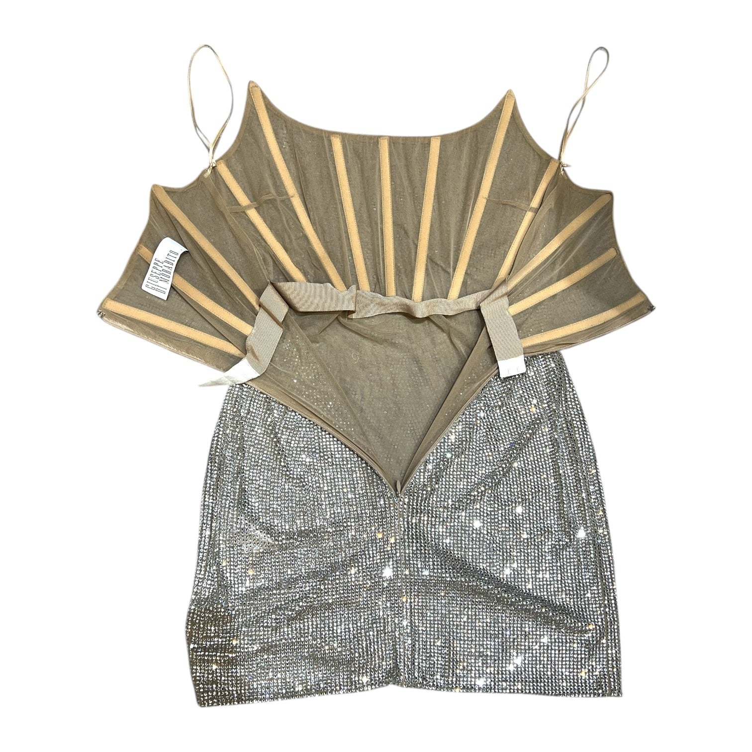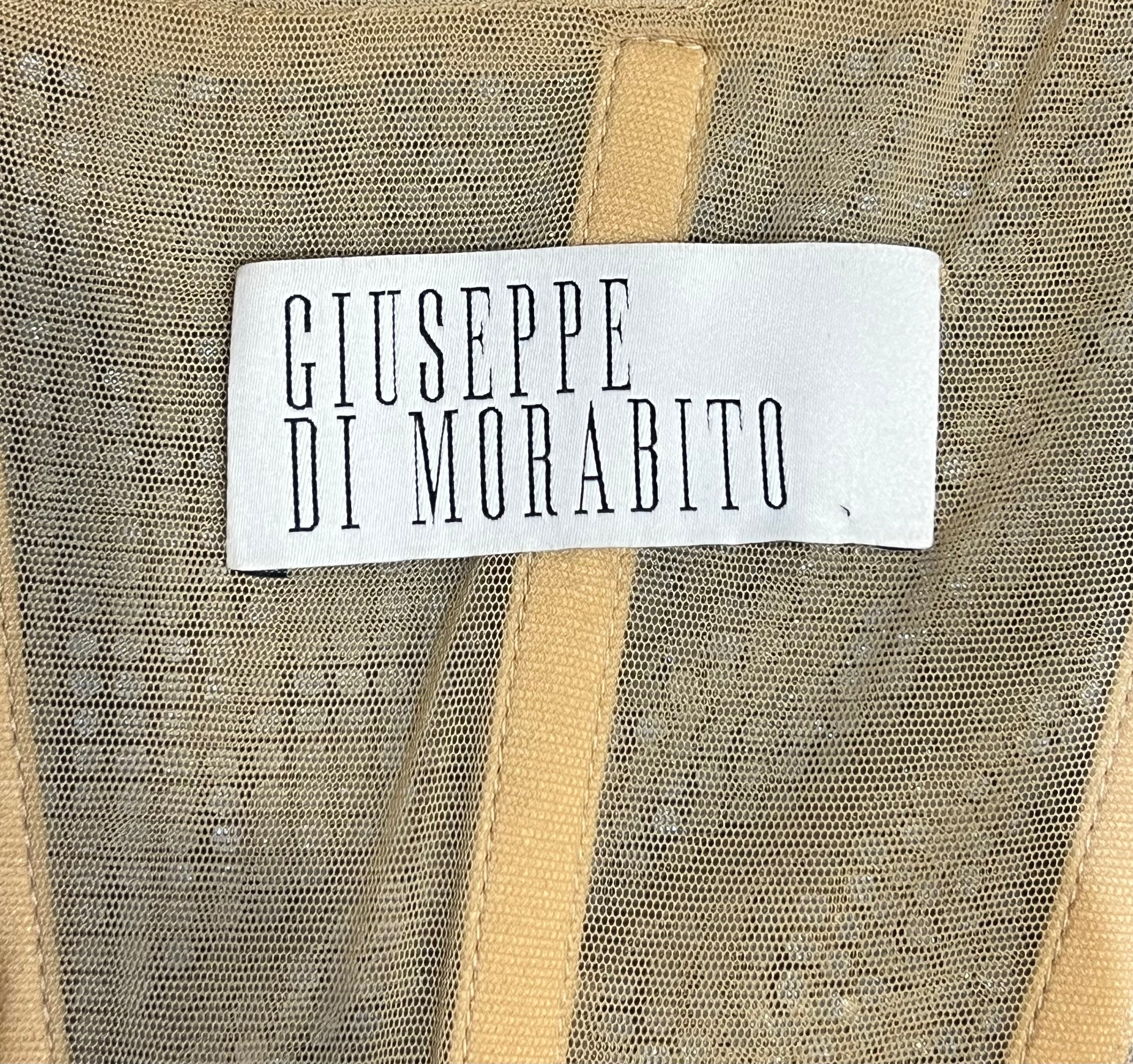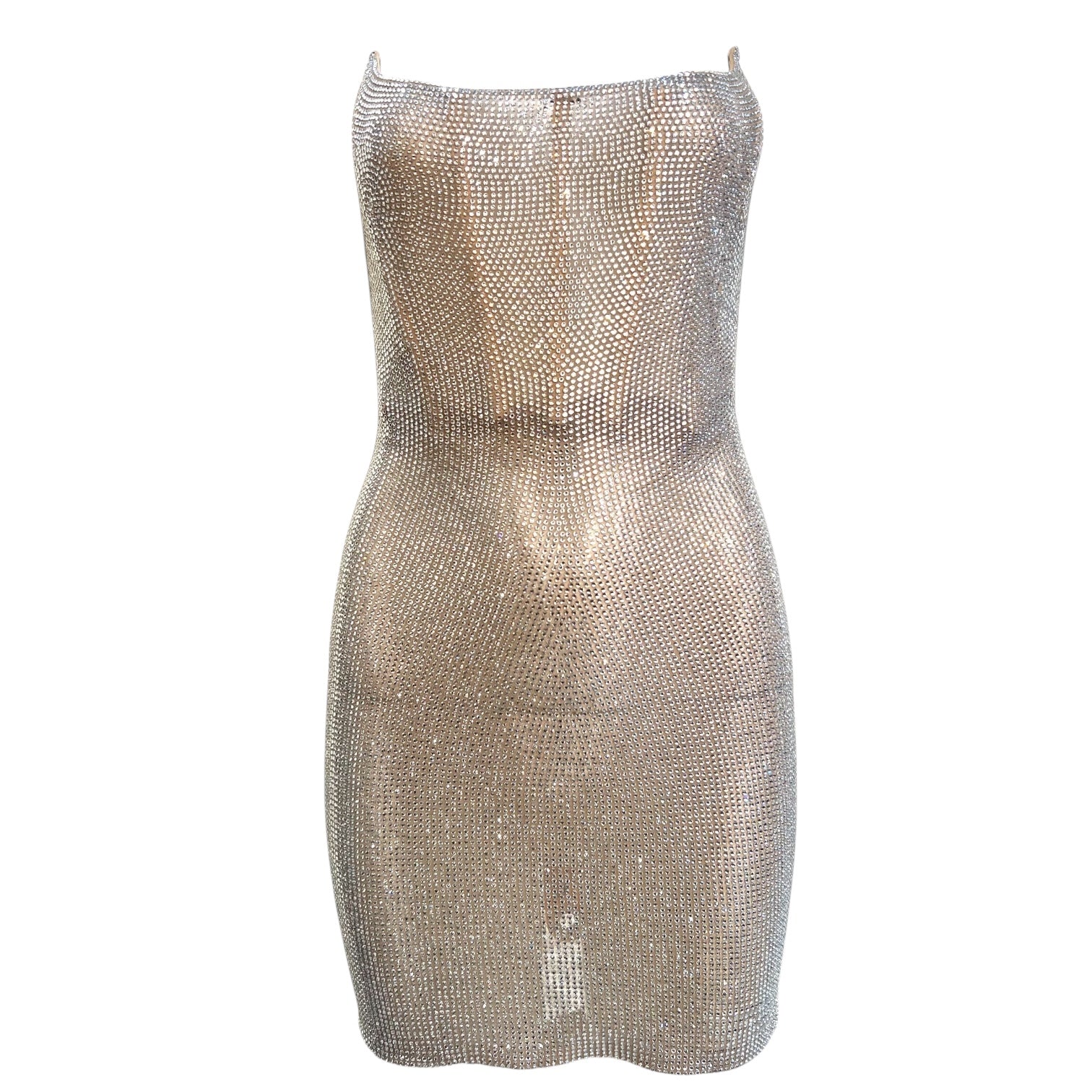 Fully embellished with sparkling crystals, this Giuseppe Di Morabito strapless mini dress is a shining example of the ever-popular "naked dress" that evolves with the trends of every era. The dress is constructed from a stretchy beige mesh and boasts a pointed square neckline and structured bodice. The bodice contains spiral steel boning, an invisible zipper along the center-back, and a ribbon clasp located at the waist for a snatched silhouette. This sexy little party dress is the ultimate head-turner.