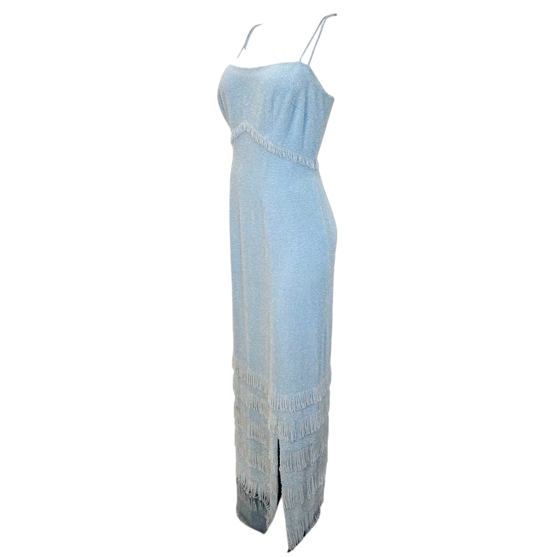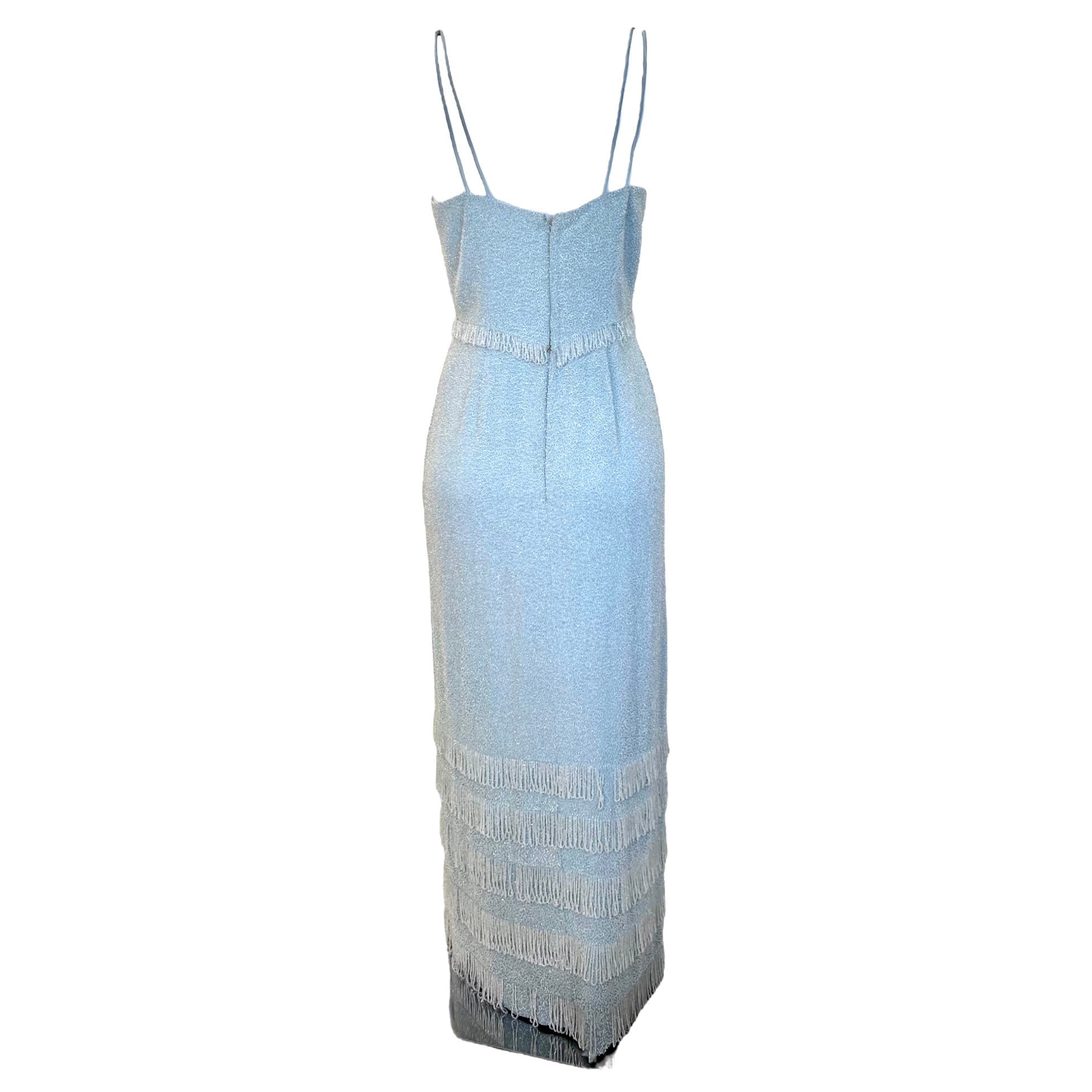 Icy and elegant black tie evening gown by J.Stitsworth. We imagine this divine piece of late 1950's glamour styled with gloves and a fabulous up-do to match back in it's day, but this timeless piece shines so bright that you don't need to fuss with all of that (unless that's your style)! Transparent seed beads decorate the entire gown with a tier of fringed beads at the empire waist and five tiers at the slit hem. Fully lined, zips closed up the back.