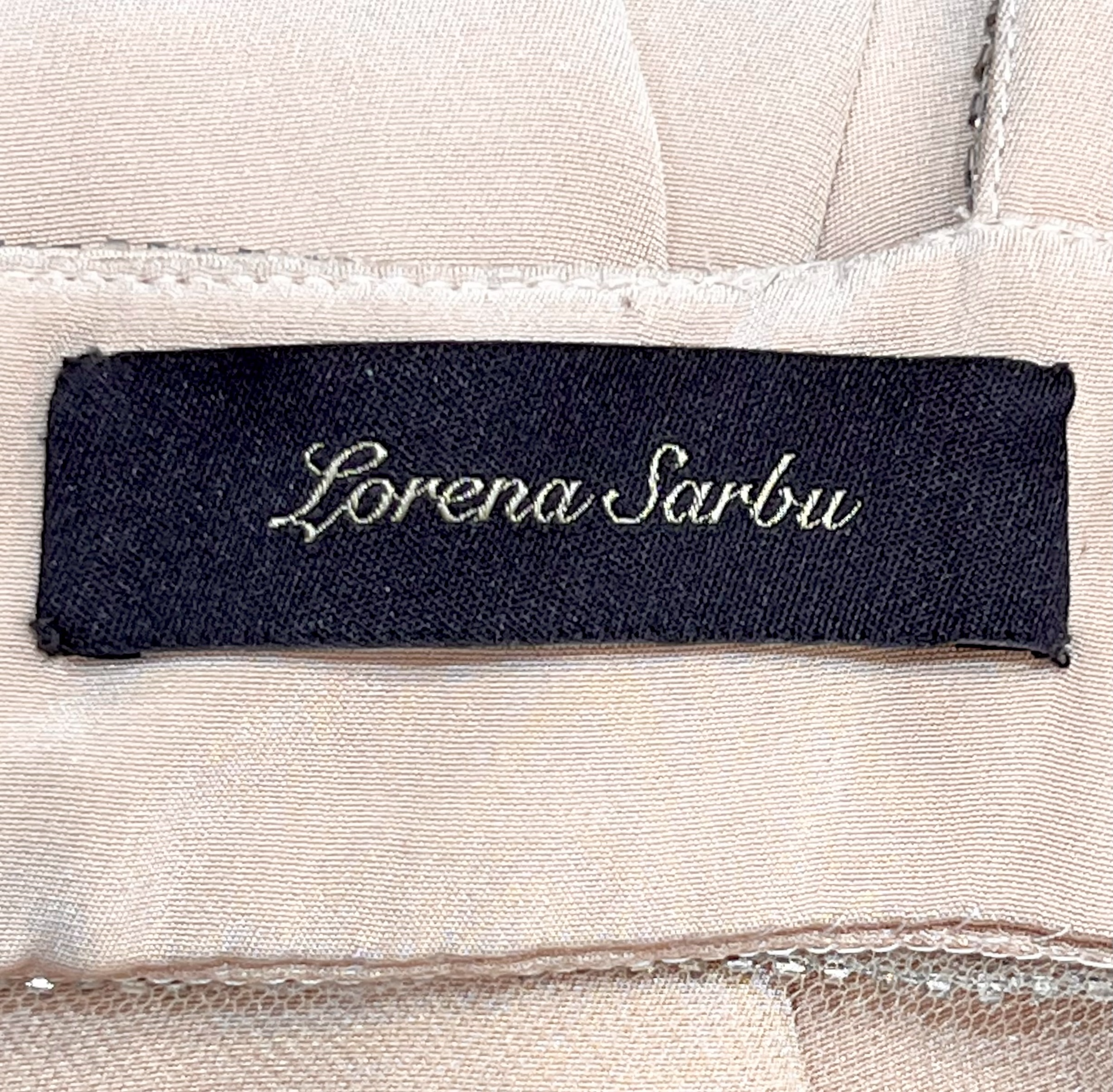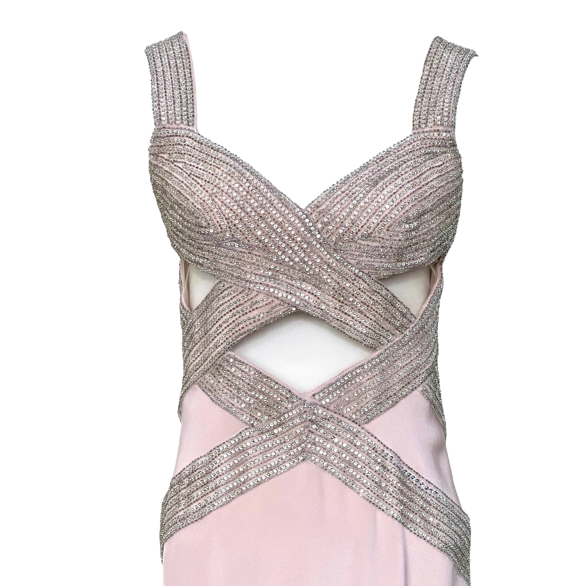 Sexy and chic Lorena Sarbu Couture Red Carpet gown from Sarbu's archive. Sarbu quietly created some iconic looks on early 2010's shows like Gossip Girl. The gown is a soft crepe jersey in a muted shade of blush pink contrasted with crossing bands of rows of silver sequin and beads and embellishments. The criss-crossing bands create illusion cut-outs at the center below the bodice, at either side, and at the back. A sparkling choice for any glitzy event! Fully line with a zip closure up the back.