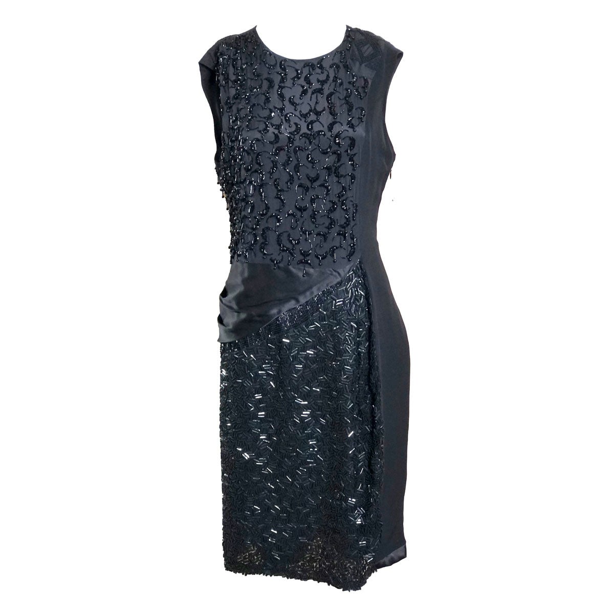 Dries Van Noten early 2000s. Black silk satin and chiffon evening dress. Intricate patchwork beadwork (seed beads, bugle beads). Simple silhouette with complex construction. Fully lined with substantial heft. Side zipper. All beadwork intact. Excellent vintage condition. Belgian artisanal luxury.
