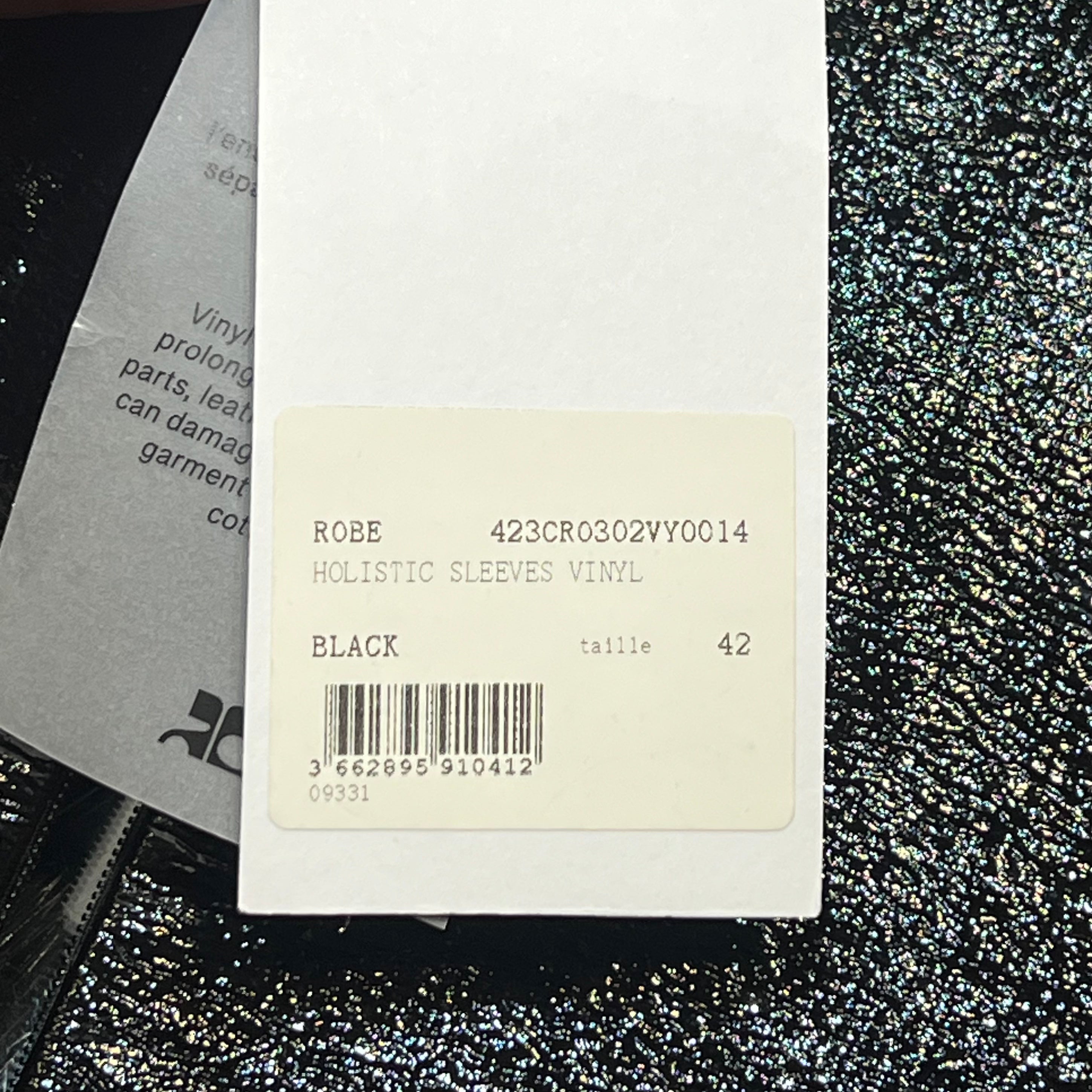 This black vinyl shift dress with it's A-frame silhouette, mock neck collar, and Space Age circular cutout will be cutting edge eternally. The sleek structure demands attention in a way that is unmistakably French-It-Girl. Fully lined in regenerated cellulose, two welt pockets on the front, and a long zip closure down the back.