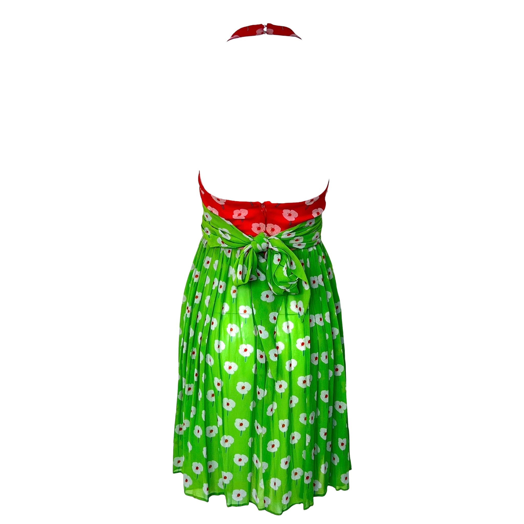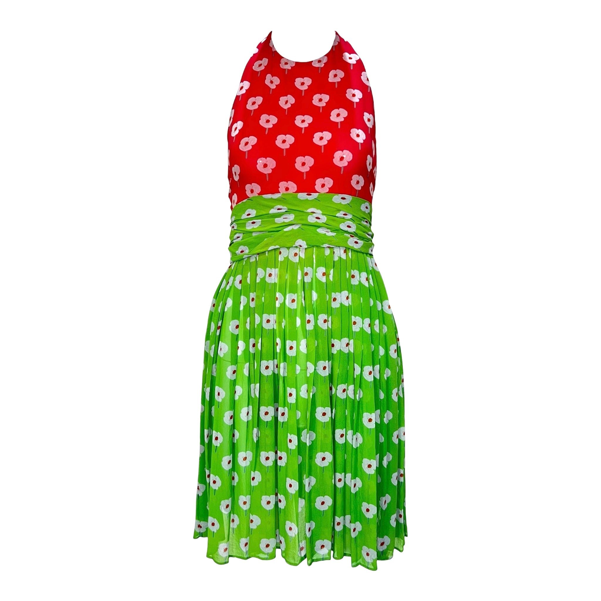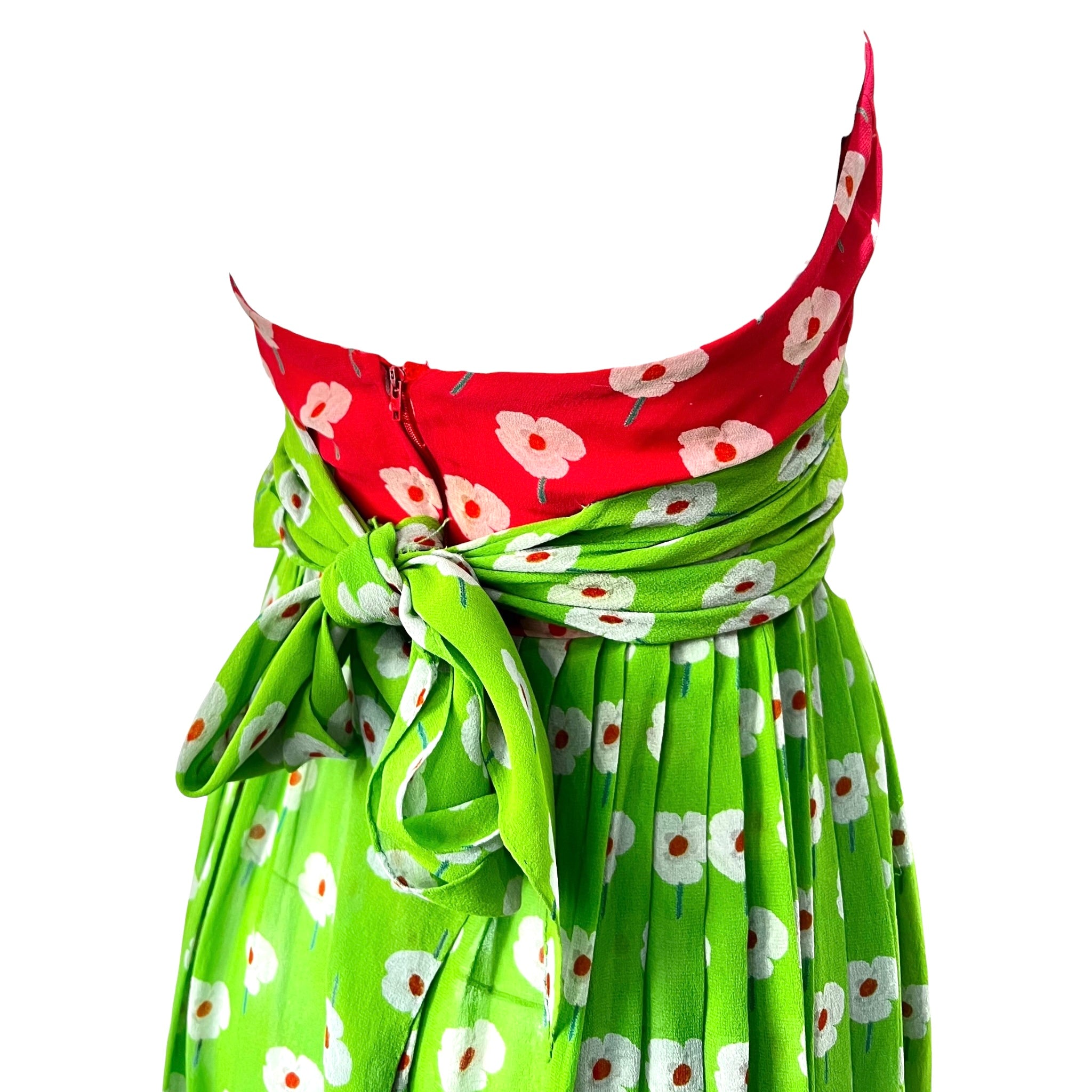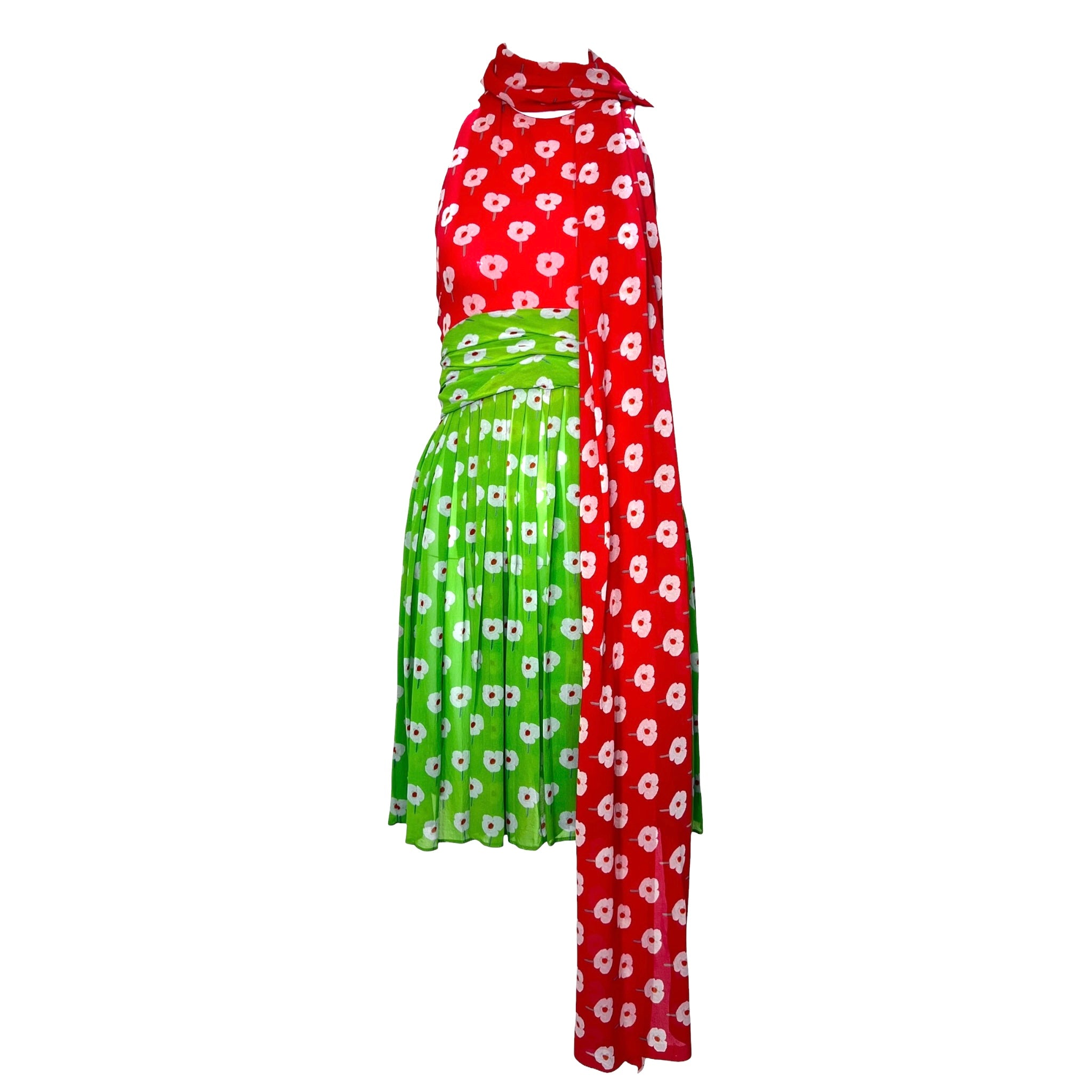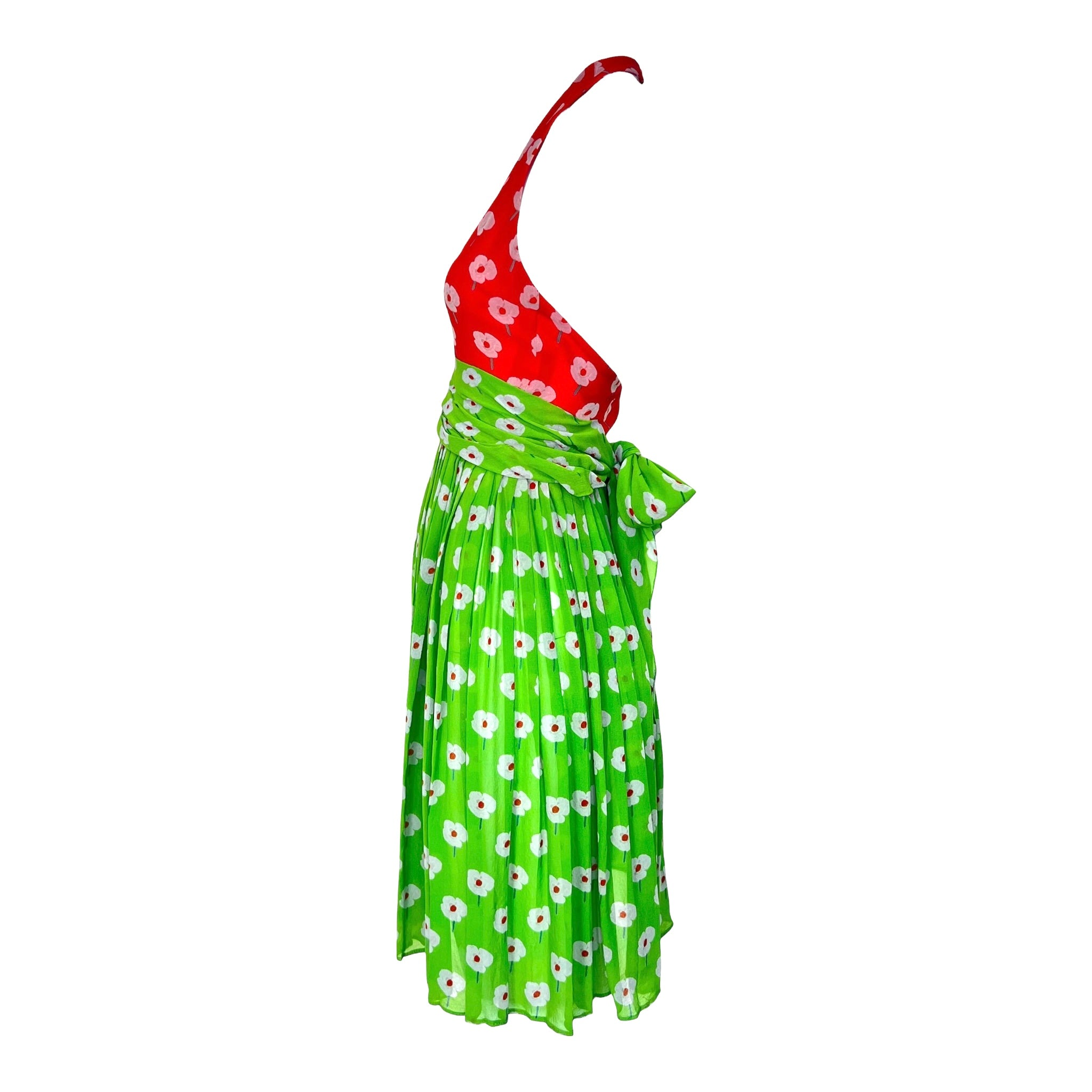 Jolie petite robe des années soixante-dix, issue de l'esprit fabuleux du créateur américain emblématique, Bill Blass, à ce qui est sans doute son âge d'or. Cette robe lumineuse et joyeuse a été vue dans une version plus longue et unie lors du défilé Bill Blass 1973 Resort ! Mousseline de soie à imprimé floral pop-art discret dans des tons juteux de rose pastèque et de vert citron avec des coquelicots blancs. La mousseline flottante est construite en une silhouette composée d'un décolleté licou haut, d'un corsage à dos bas, d'une ceinture verte attachée à la taille qui se noue dans le dos, et d'une jupe qui tombe en plis libres à partir de la taille. La robe est agrémentée d'un long foulard rose assorti qui peut être drapé sur les épaules ou même porté en turban. La robe se ferme par des crochets à l'arrière du cou et par une fermeture éclair dans le dos. Cet adorable ensemble est parfait pour rester au frais pendant les chauds mois d'été !