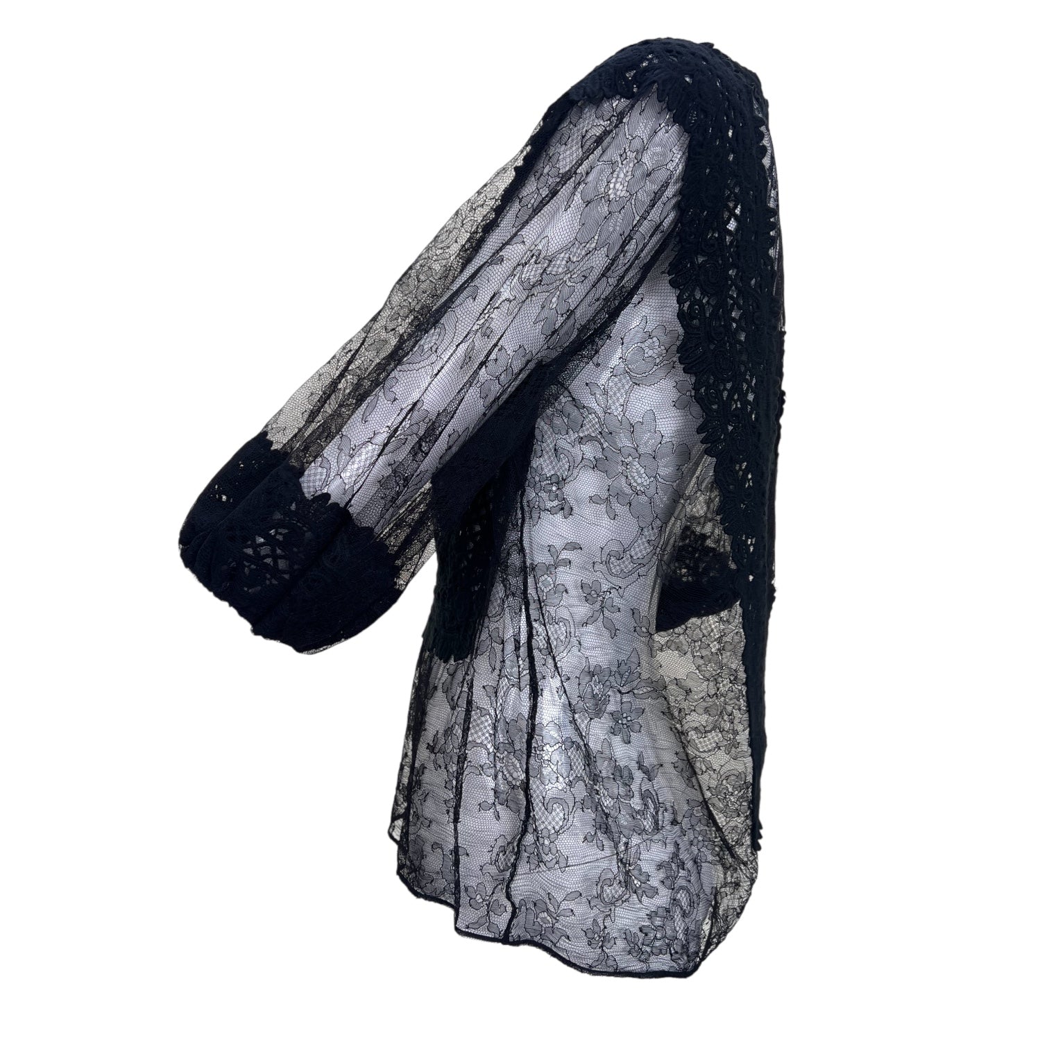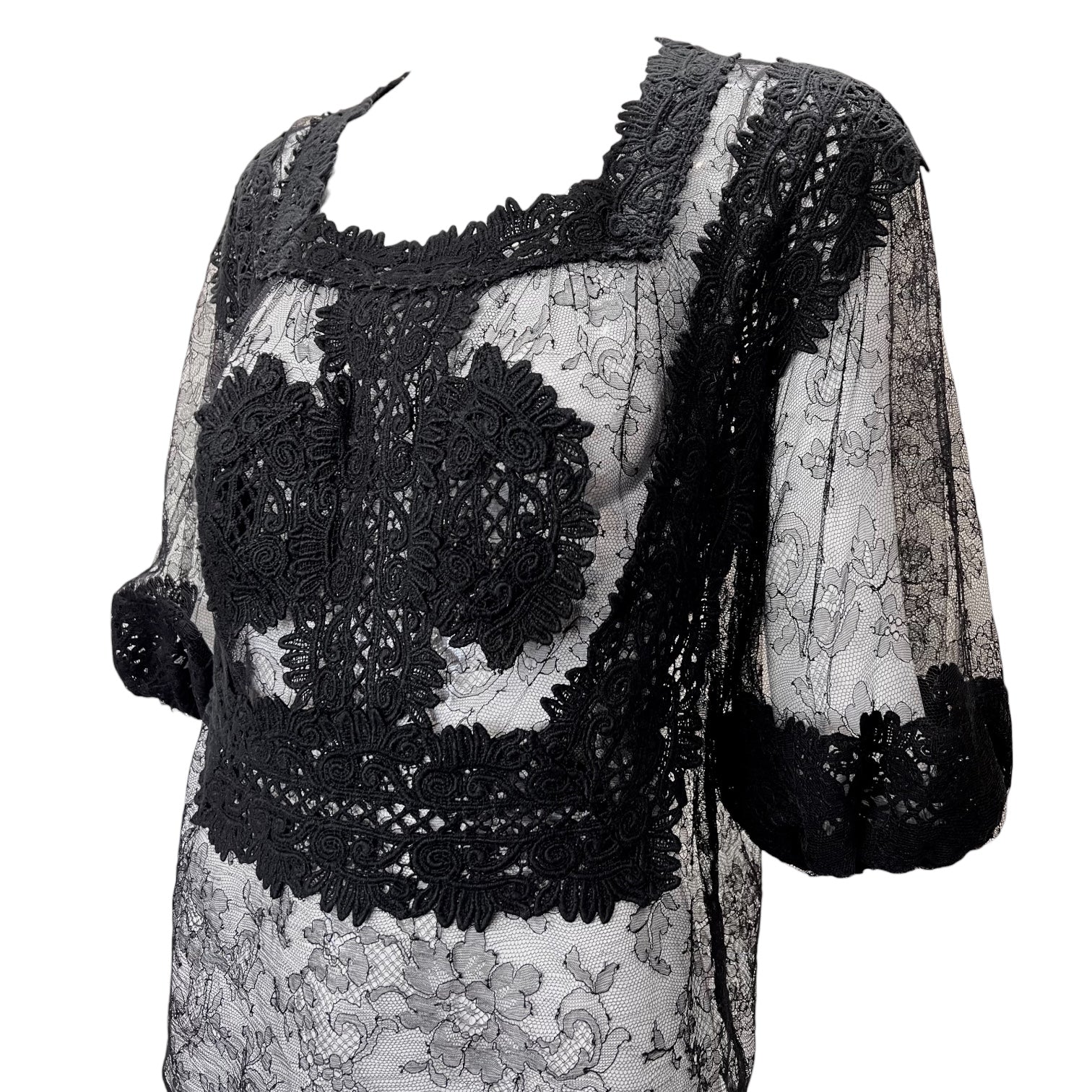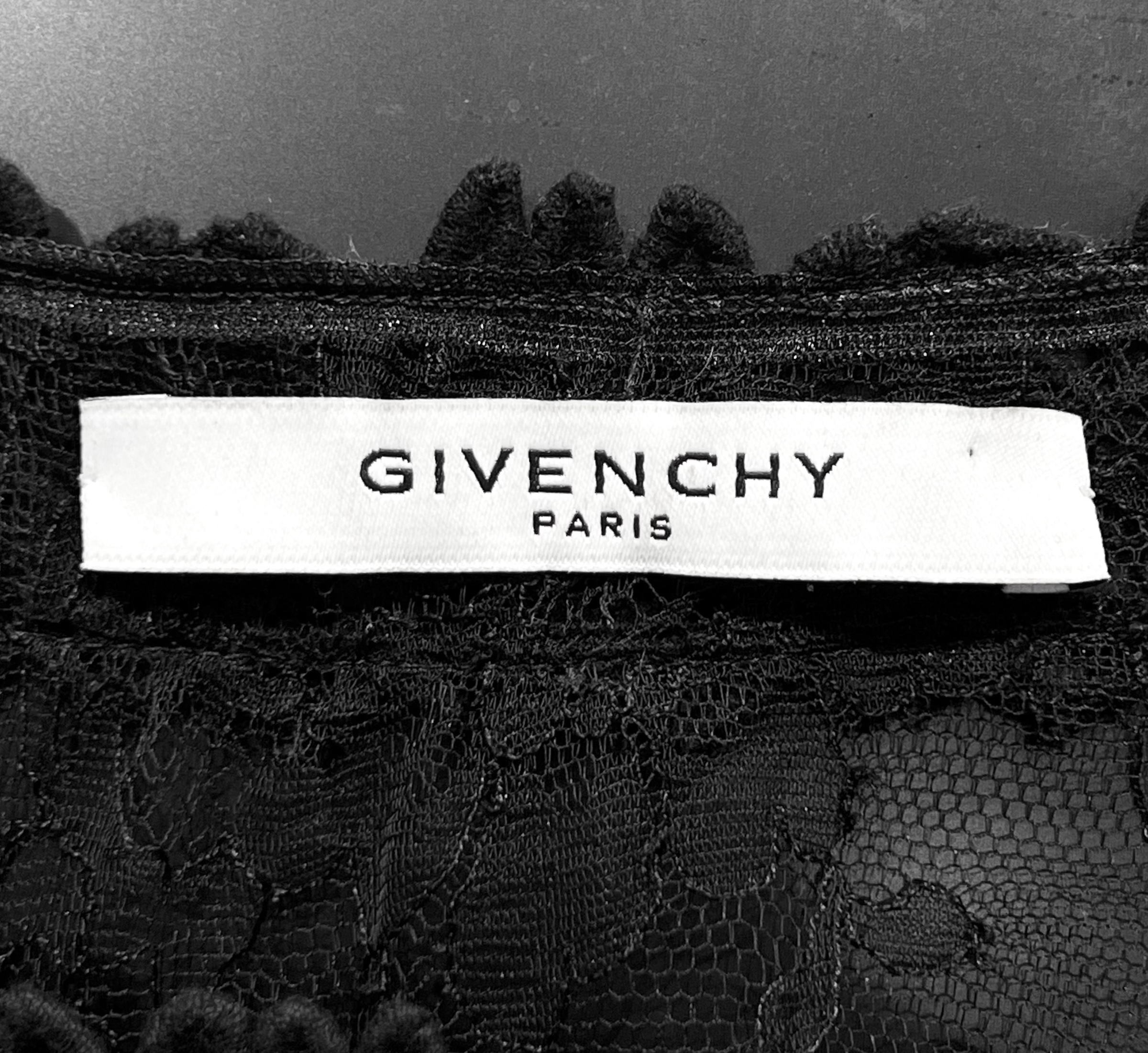 Beautiful black lace blouse from Givenchy's 2011 Resort collection. The blouse is constructed from black chantilly lace with Irish crochet lace appliqué. The appliqué decorates the blouse at the collar, sleeve hems, and creates geometric patterns at the chest and back. The blouse is unlined and semi-sheer. The billowing short sleeves gather with elastic at the mid-arm. Pull-on style, no added closure. The content and size label have been removed.
