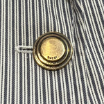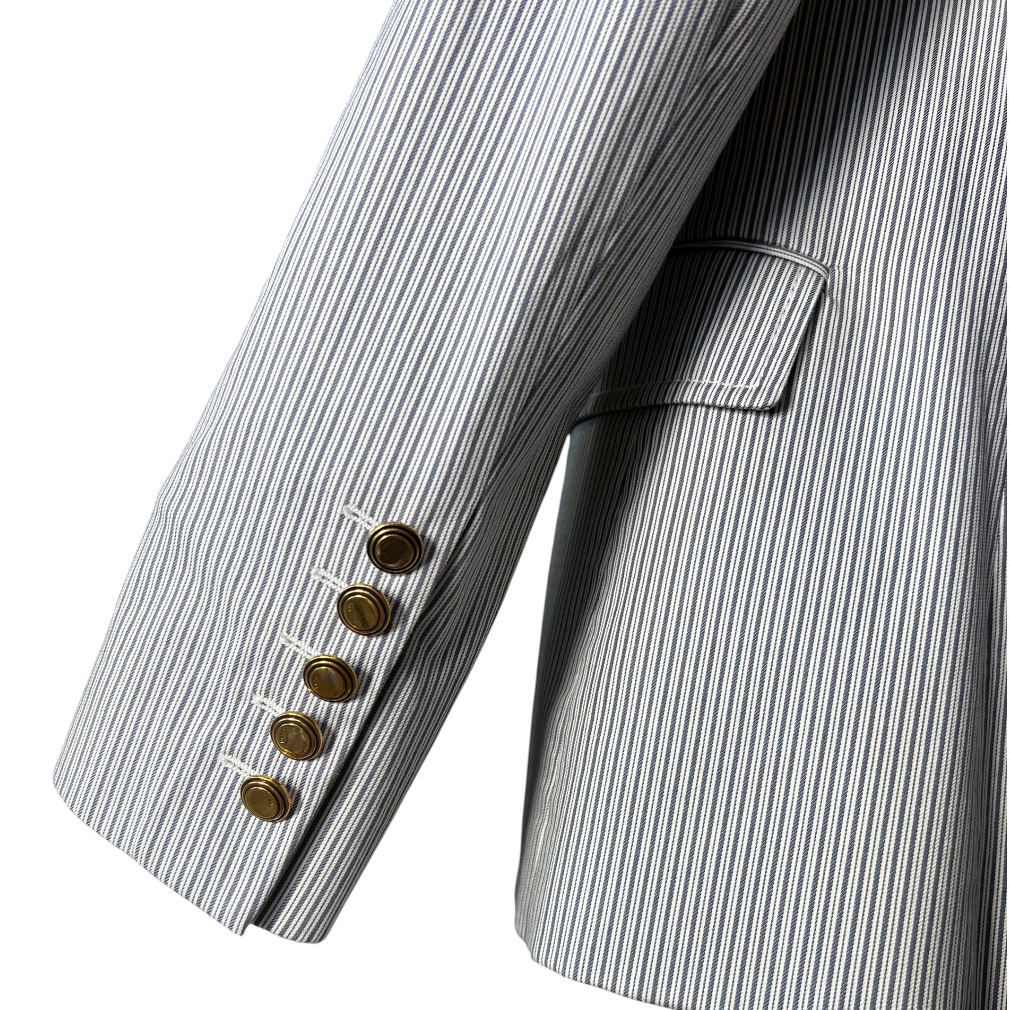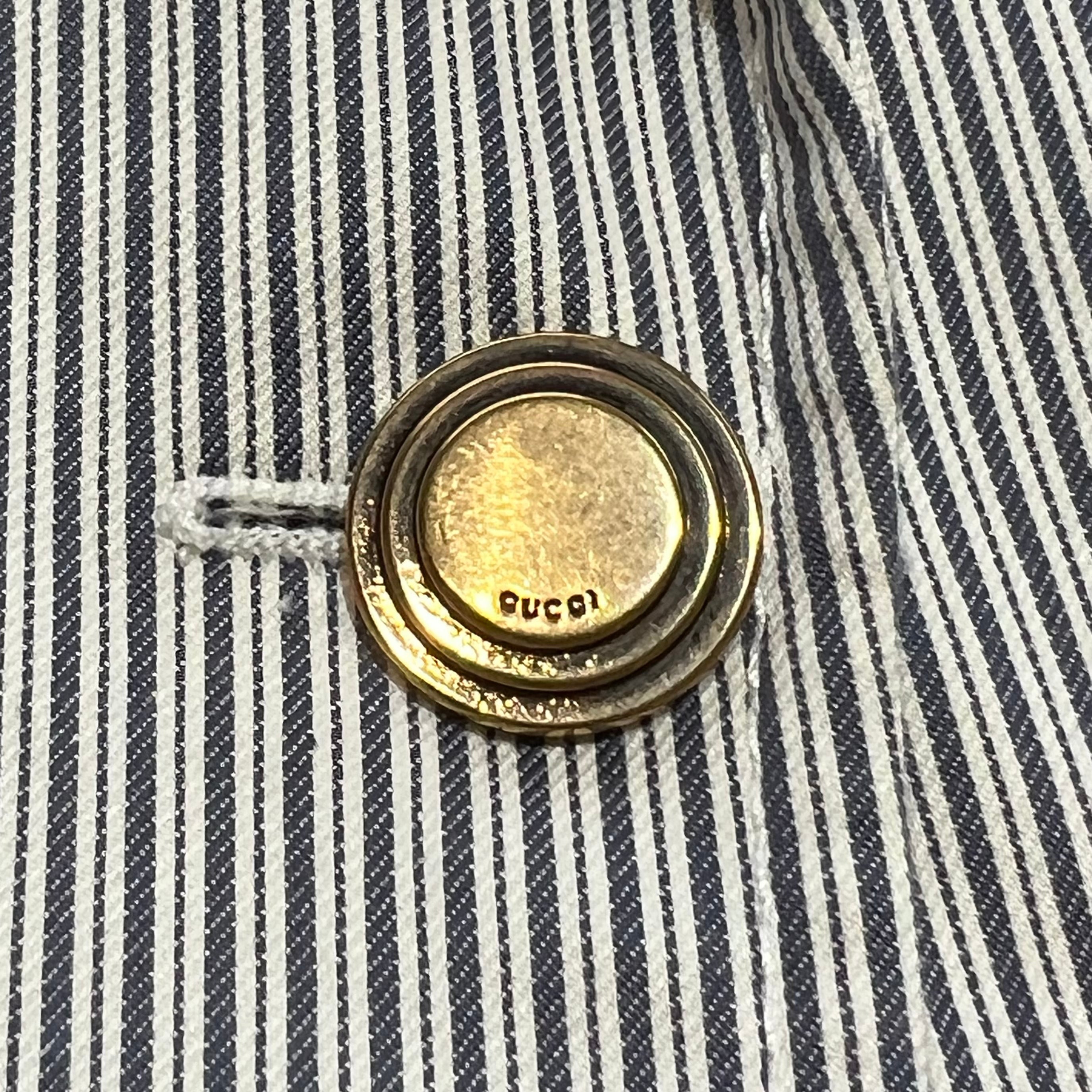 Classic Gucci blue-grey pinstripe blazer jacket, circa late 2000's to early 2010's. Effortless yet polished and just a touch preppy, coastal, and nautical. Wonderful for layering with summer whites. Breathable cotton ticking with vertical elongating stripes in a timeless bluish grey and white pinstripe. Laid-back single button closure, slim notched lapels, and two envelope pockets a the sides. The cuffs are decorated with 5 aged brass logo buttons for an old money, prep school touch. Fully lined in silk.