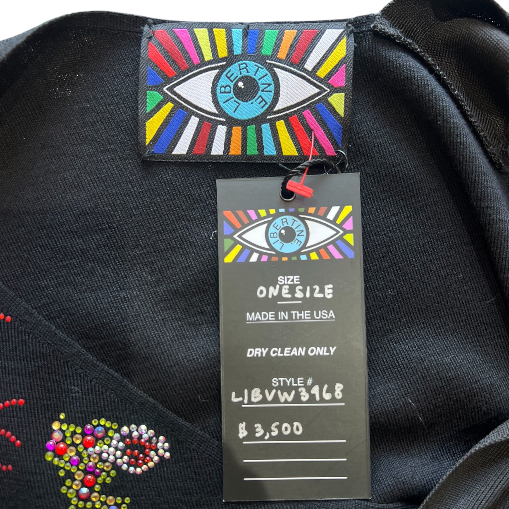 Laissez-vous envoûter par un style preppy et punk exaltant avec cette robe courte et raffinée, signée Libertine, la maison de couture de Los Angeles. Issue de la collection Automne 2017, cette pièce incroyable n'a pas défilé, mais nous vous proposons d'admirer (et d'apprécier !) des photos de looks similaires présentés lors du défilé. Nombre de créations Libertine sont réalisées à partir de pièces vintage de créateurs recyclées, comme c'est le cas pour cette robe. La mini-robe en laine noire dissimulée sous les ornements est une petite robe noire Valentino emblématique des années 2000.