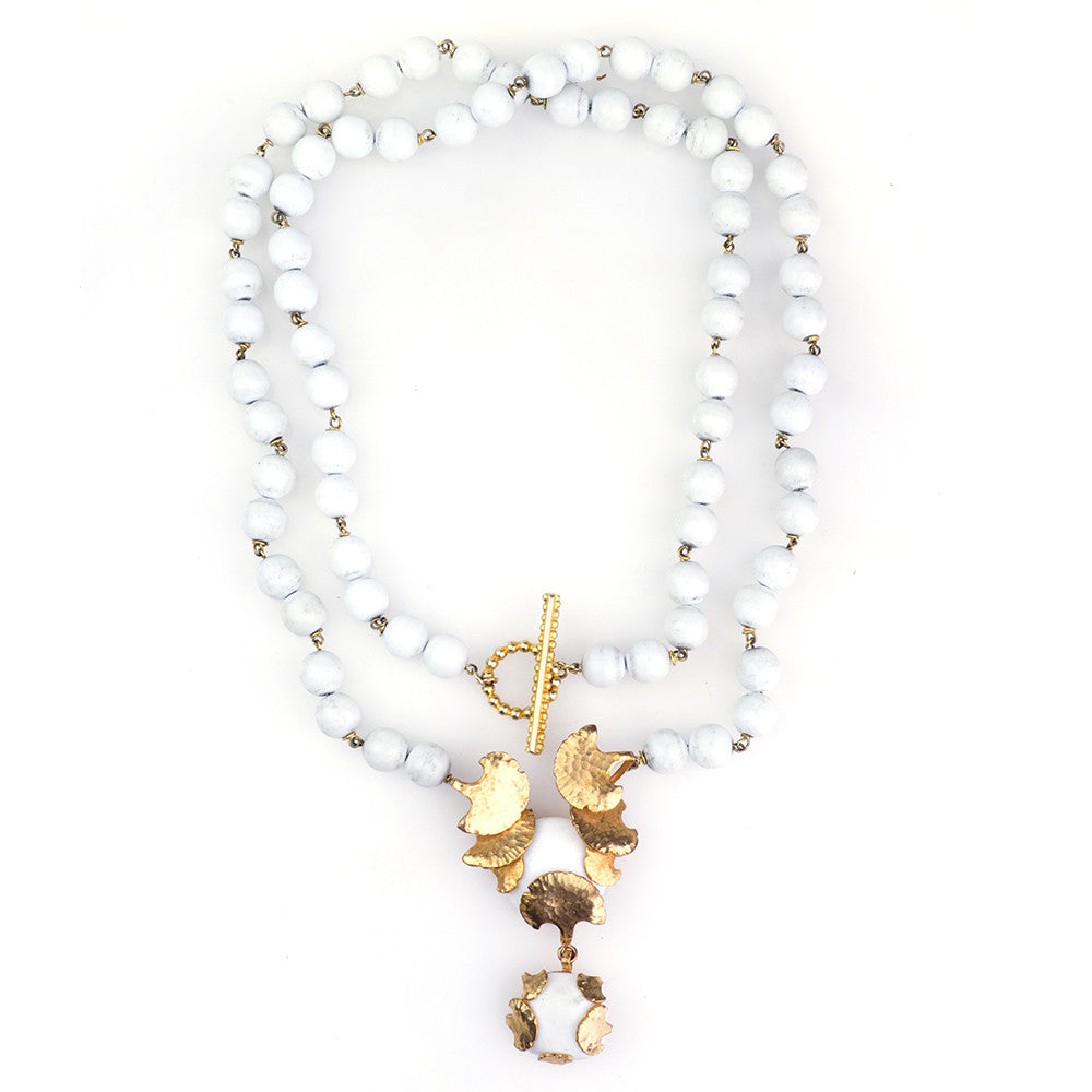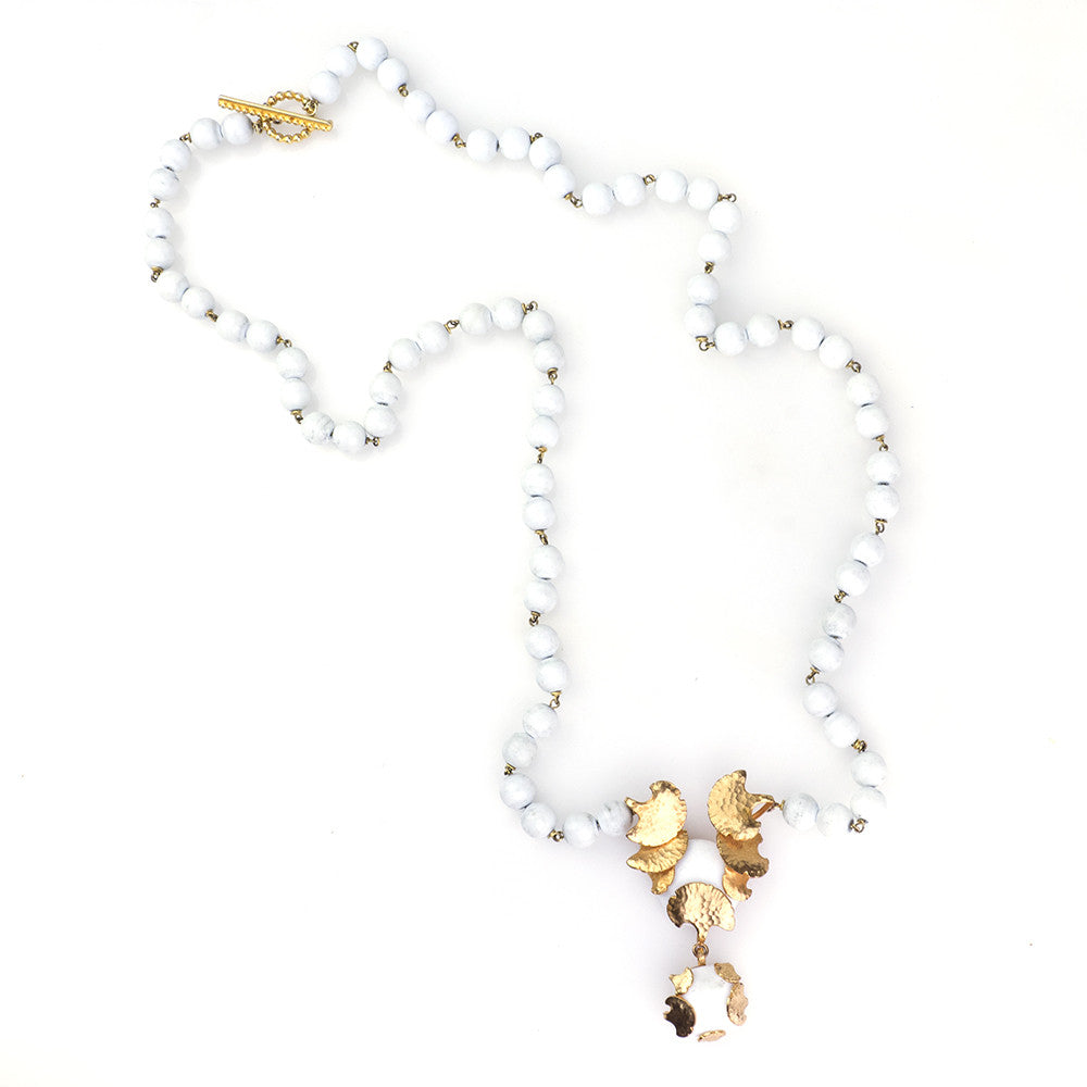 Collier extra-long en perles de céramique blanche. Fermoir à bascule. Pendentif orné d'un bronze authentique martelé. Excellent état.