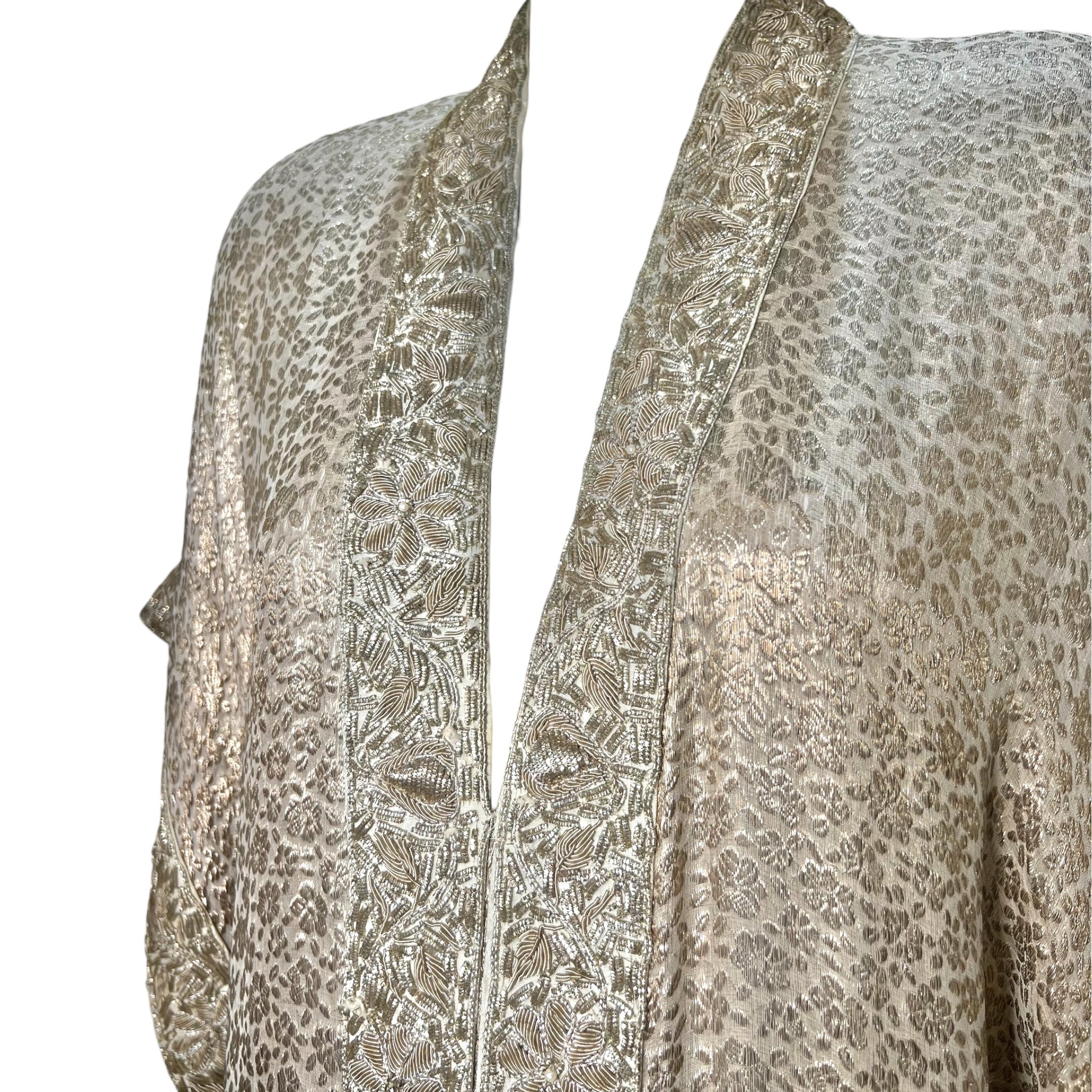 The gorgeous champagne gold lamé jacquard drapes like liquid metal in a straight silhouette. The scarf can be tied at the waist as a belt, draped on the arms as a shawl, or even worn as a head scarf. The sleek lines of the silhouette are emphasized by the Indian inspired gold Dabka embroidery in a dense floral motif that complements the smaller floral motif of the jacquard. This embroidered trim decorates the half-kimono sleeves as well. The wide sleeves feature what may be our favorite detail-- tassels! On either sleeve, there is a divine braided lamé tassel with teeny imitation pearls. The dress is similar to a kaftan or tunic with a pull-on style opening, no additional closures aside from the single hook and eye at the chest. The dress is fully lined in a champagne silk chiffon.