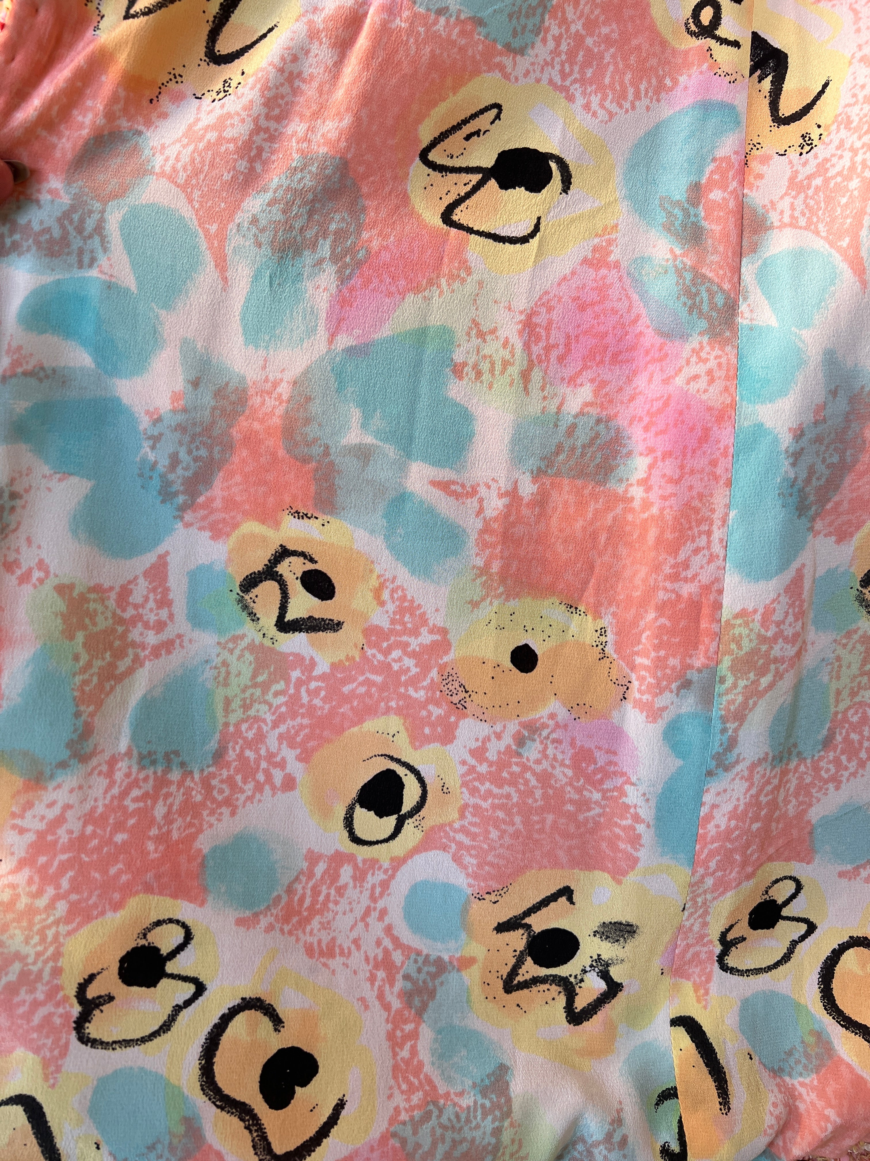 A fabulous Chanel coat from Lagerfeld's beloved and sought after Spring/Summer 1997 collection. This delicious overcoat comes in a peachy pink with flecks of a candy-colored Lesage bouclé with metallic strands woven into the tweed. Simple, straightforward, classic Chanel coat silhouette consisting of a petite collar, button-up closure down the front, buttons at the cuffs, and envelope pockets at the bust and hips. The coat is adorned with clear resin buttons with raised gold-toned Chanel monograms. The metallic strands are light-catching, iridescent tinsel in various pale pastels. The lining is a printed silk crêpe de chine with a dreamy pale pink, blue, and yellow abstract watercolor floral motif.