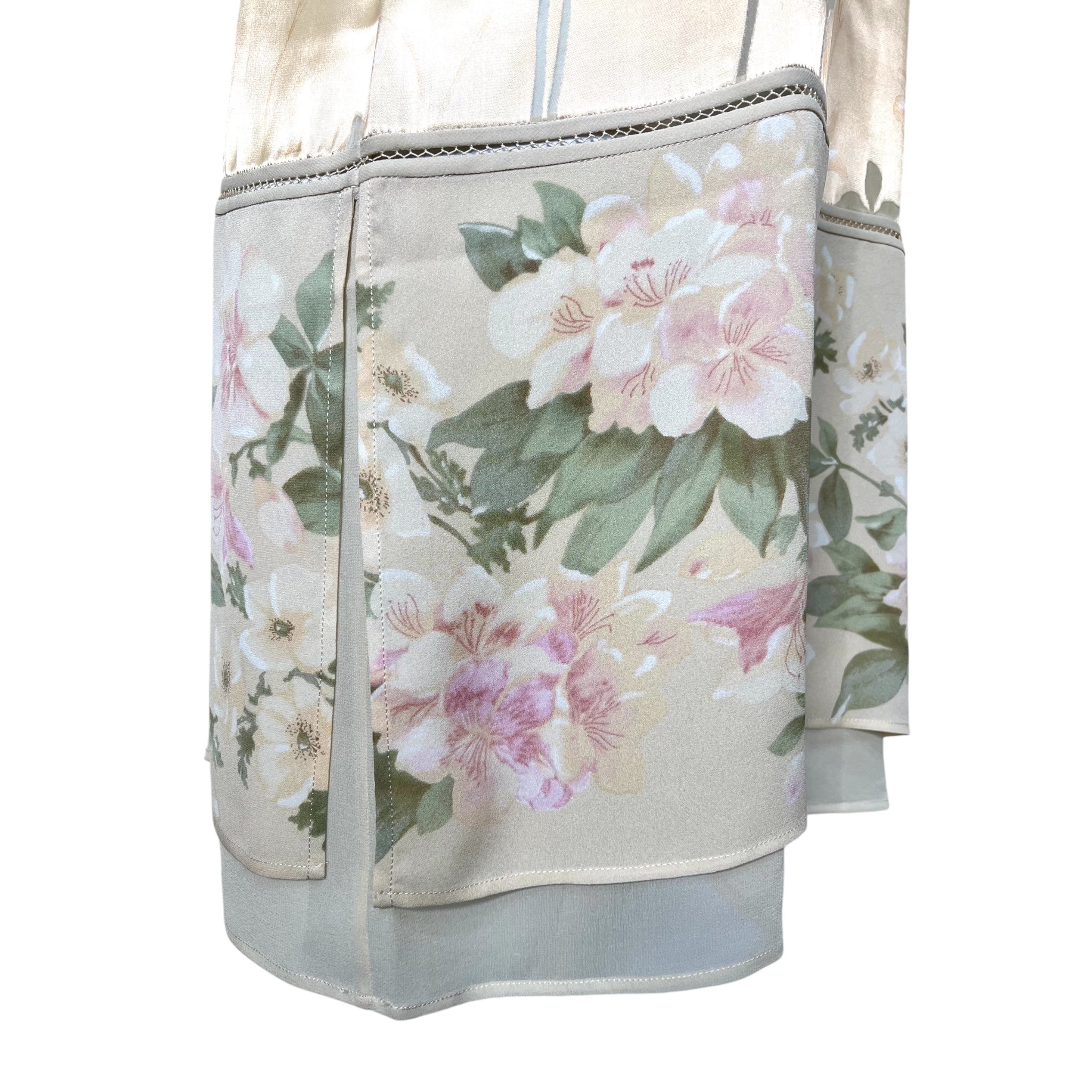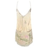 Cream satin slip dress from the Italian luxury lingerie experts, La Perla. Simple and sexy straight-line silhouette with side slits at hem. Cream satin with sheer floral shaped cut-outs. The lower half of the dress features an ivory panel with a printed pink and green floral motif. Sheer bone colored chiffon paneling at hem. Perfect bridal accessory for those candid behind the scenes photos the morning of the big day! Excellent condition.