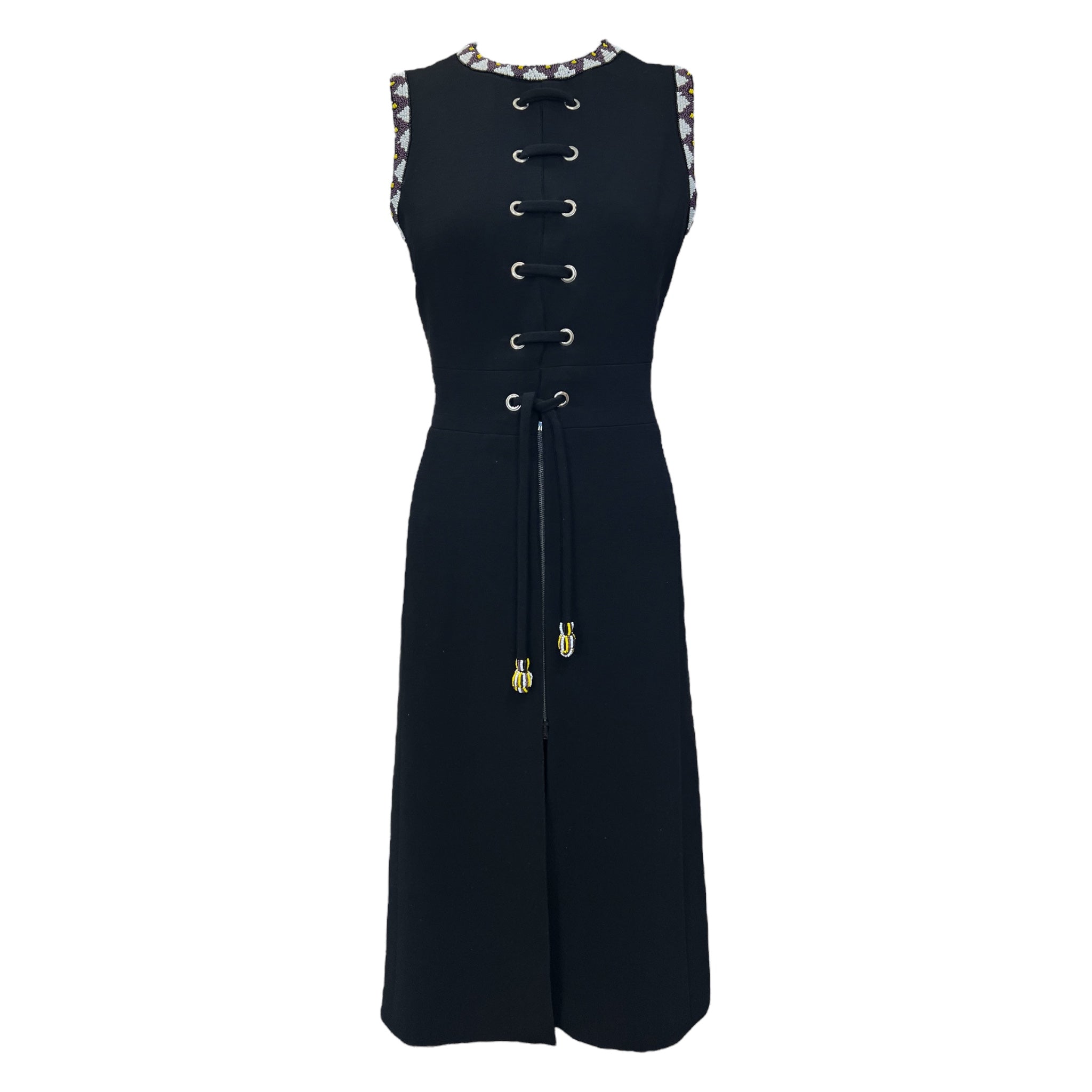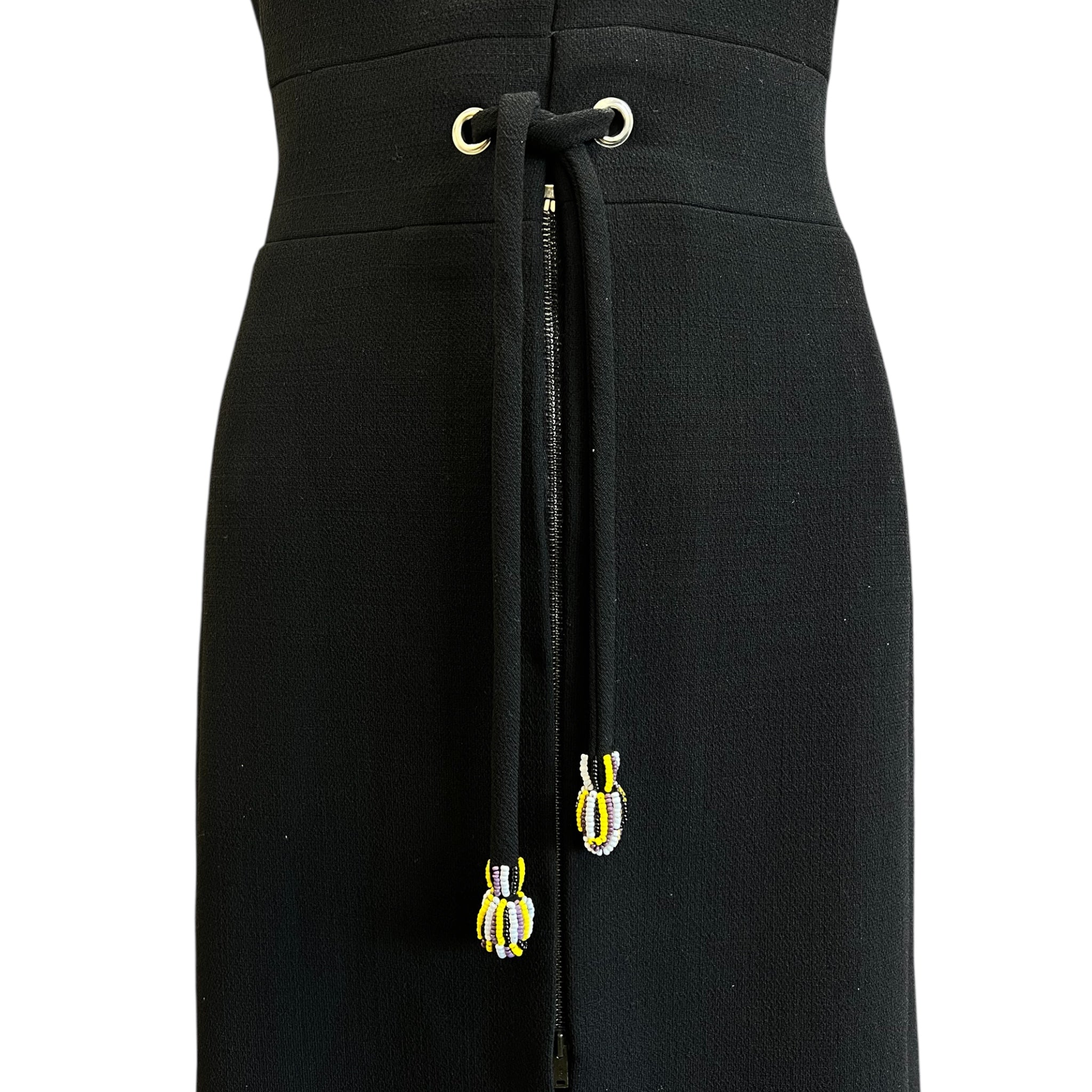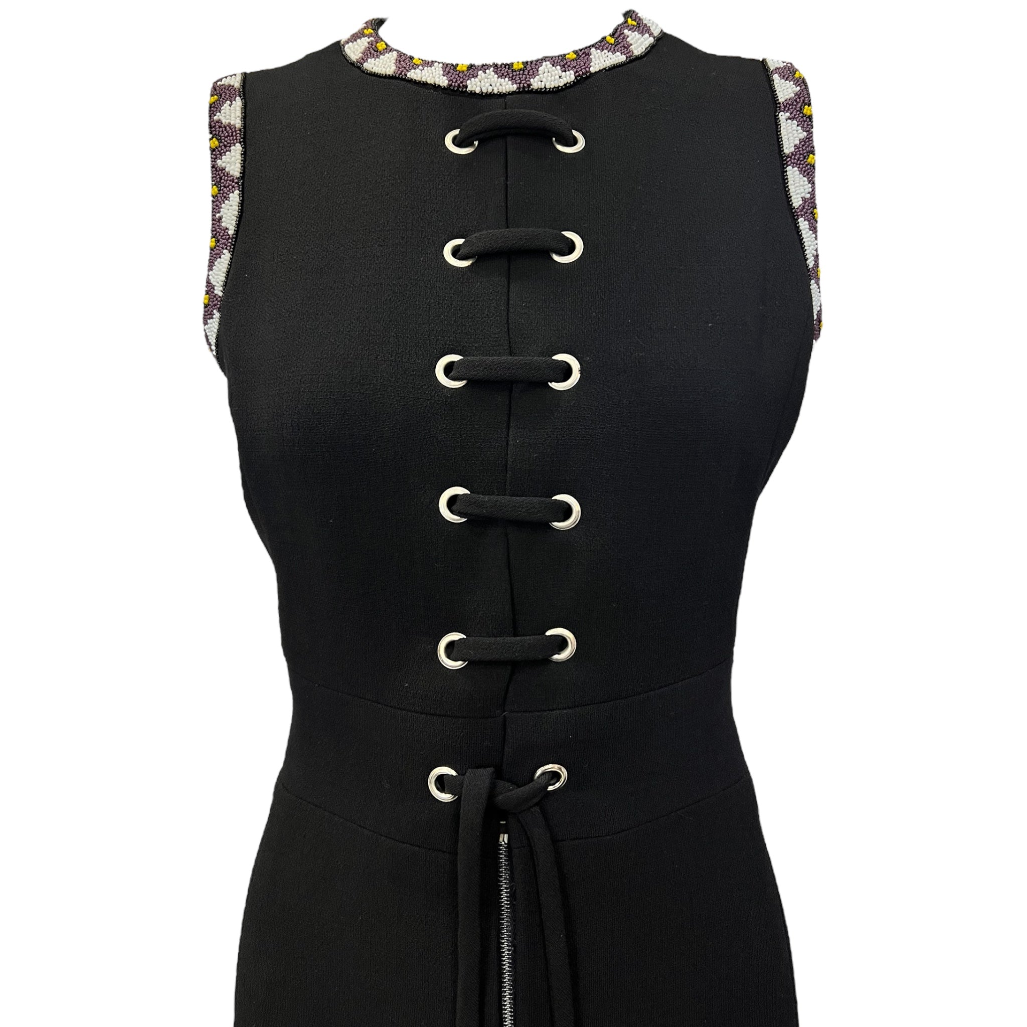 Chic with an edge, 1970's lace-up dress by Louis Feraud. Black wool crepe sleeveless tunic-style dress with jewel neckline and arm holes embellished in white, yellow, and purple seed beads, front bodice lace up detail with waist ties, zippered front skirt, and center back zipper closure. Very good to excellent condition.