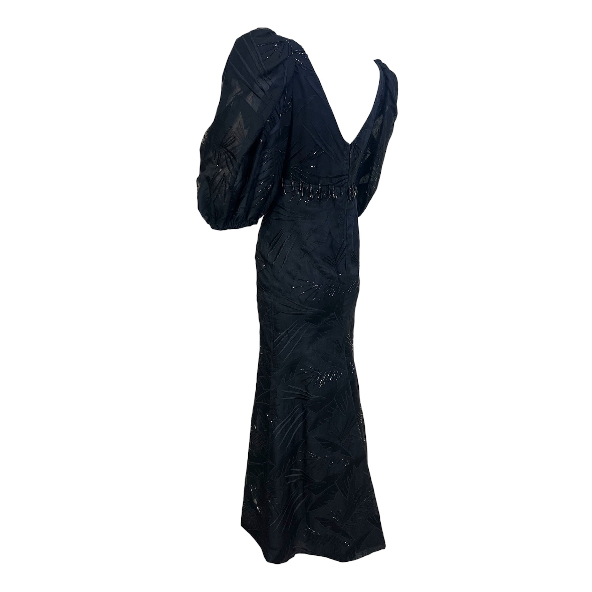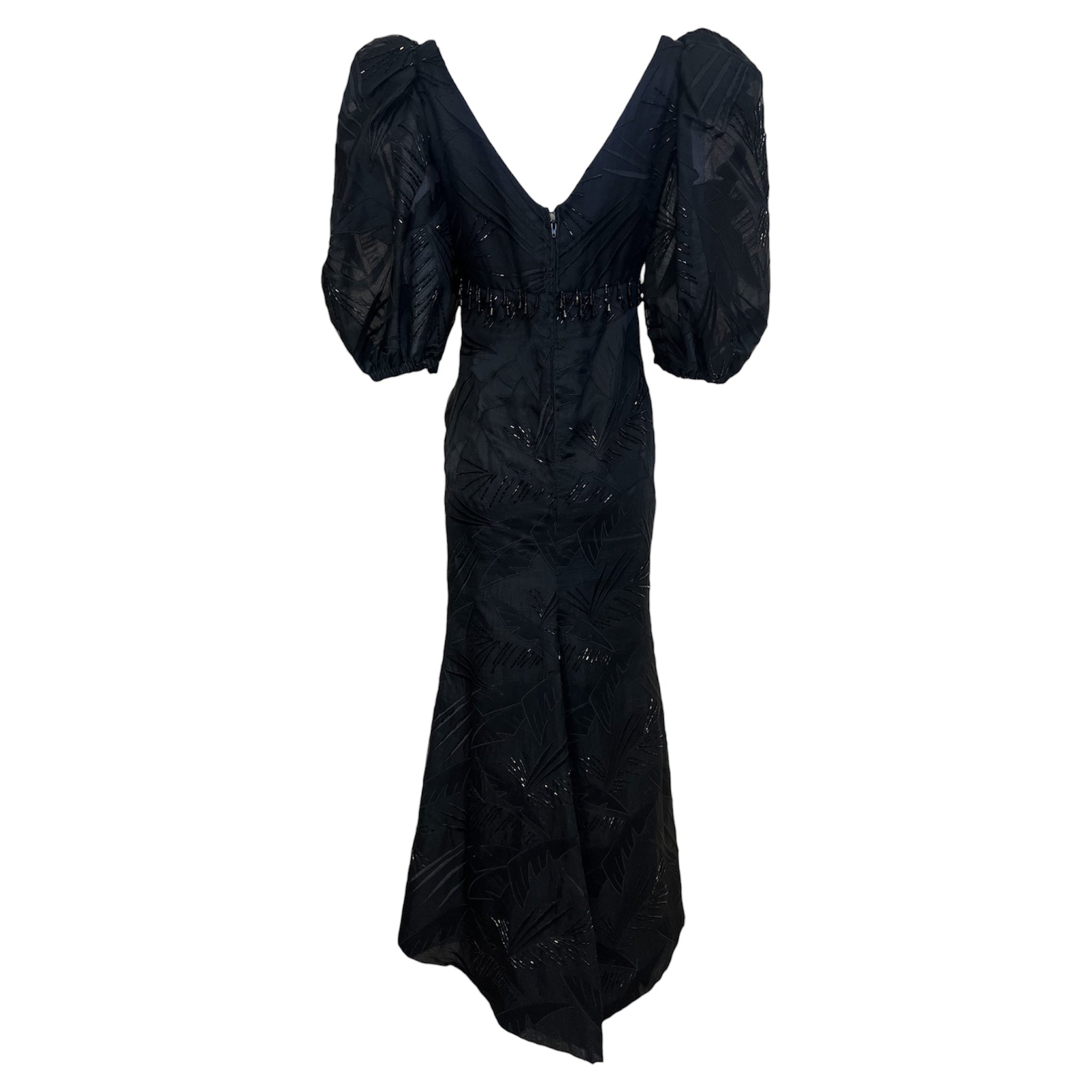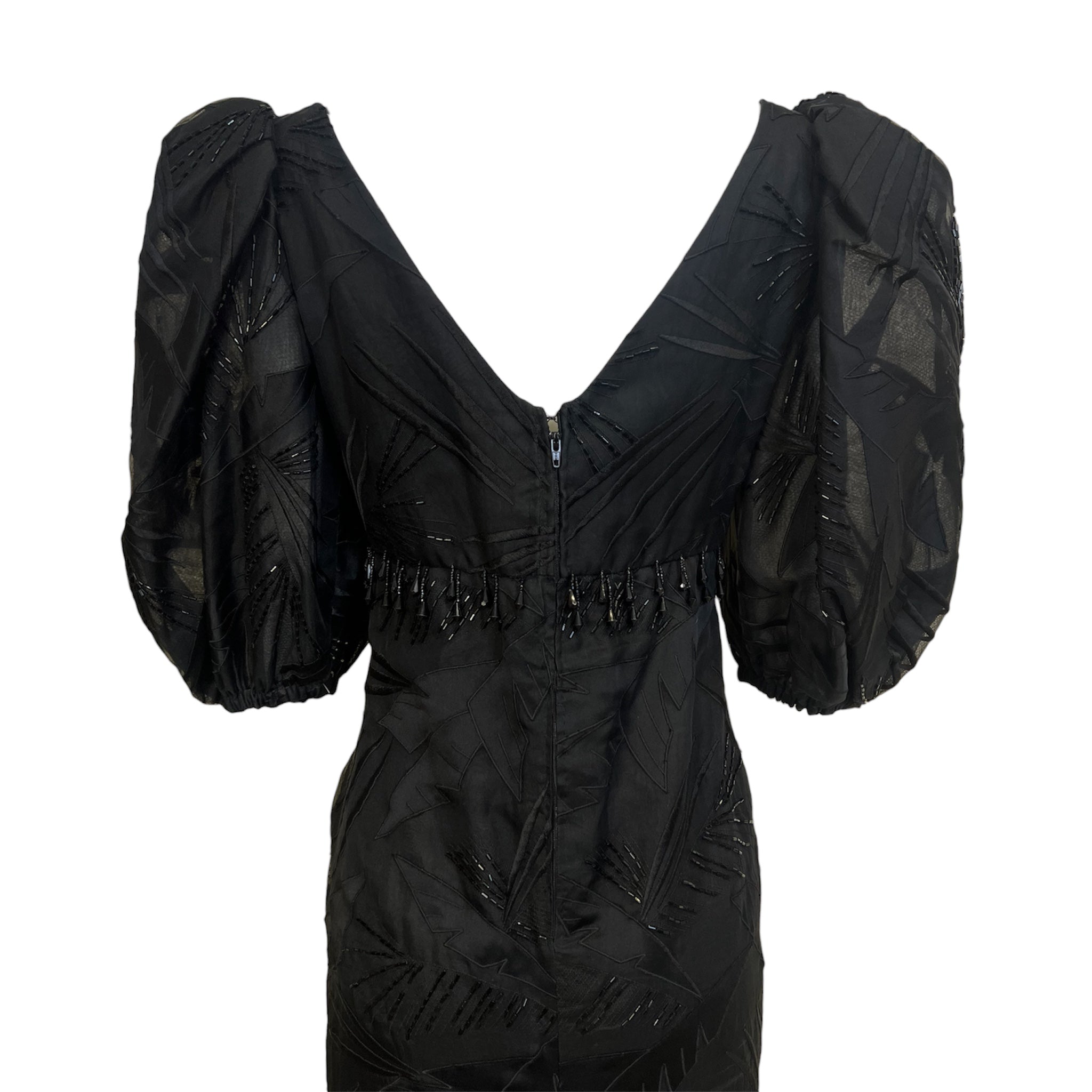 A spectacular piece from a true Los Angeles gem. Ruben Panis, known as the "Outstanding Filipino Couturier of Beverly Hills". Panis's beaded evening gowns were coveted by icons of glamour such as Elizabeth Taylor and Zsa Zsa Gabor. The dramatic puff sleeve silhouette of this gown is undoubtedly inspired by Panis's Filipino heritage. The traditional Filipina Terno silhouette consists of distinct butterfly sleeves and a straight skirt silhouette. This sophisticated and regal Filipina silhouette is embellished with a hybrid of Beverly Hills glamour. Foliage is embroidered all over the gown with black beaded accents. Rows of dangling beaded fringe decorate the empire waist just below the bodice. Straight silhouette from the empire waist down with a slight flare at the hem. Rare and collectible.