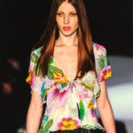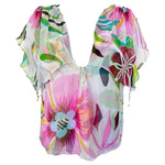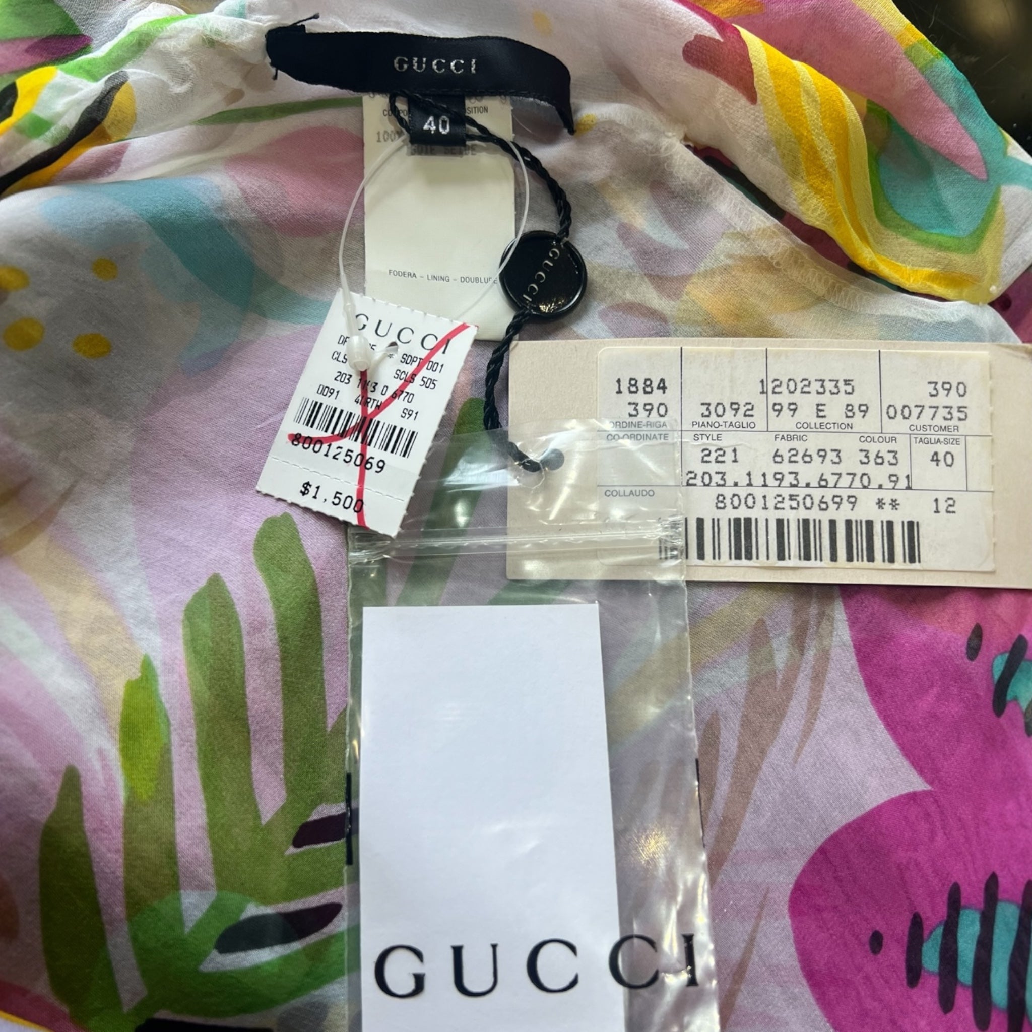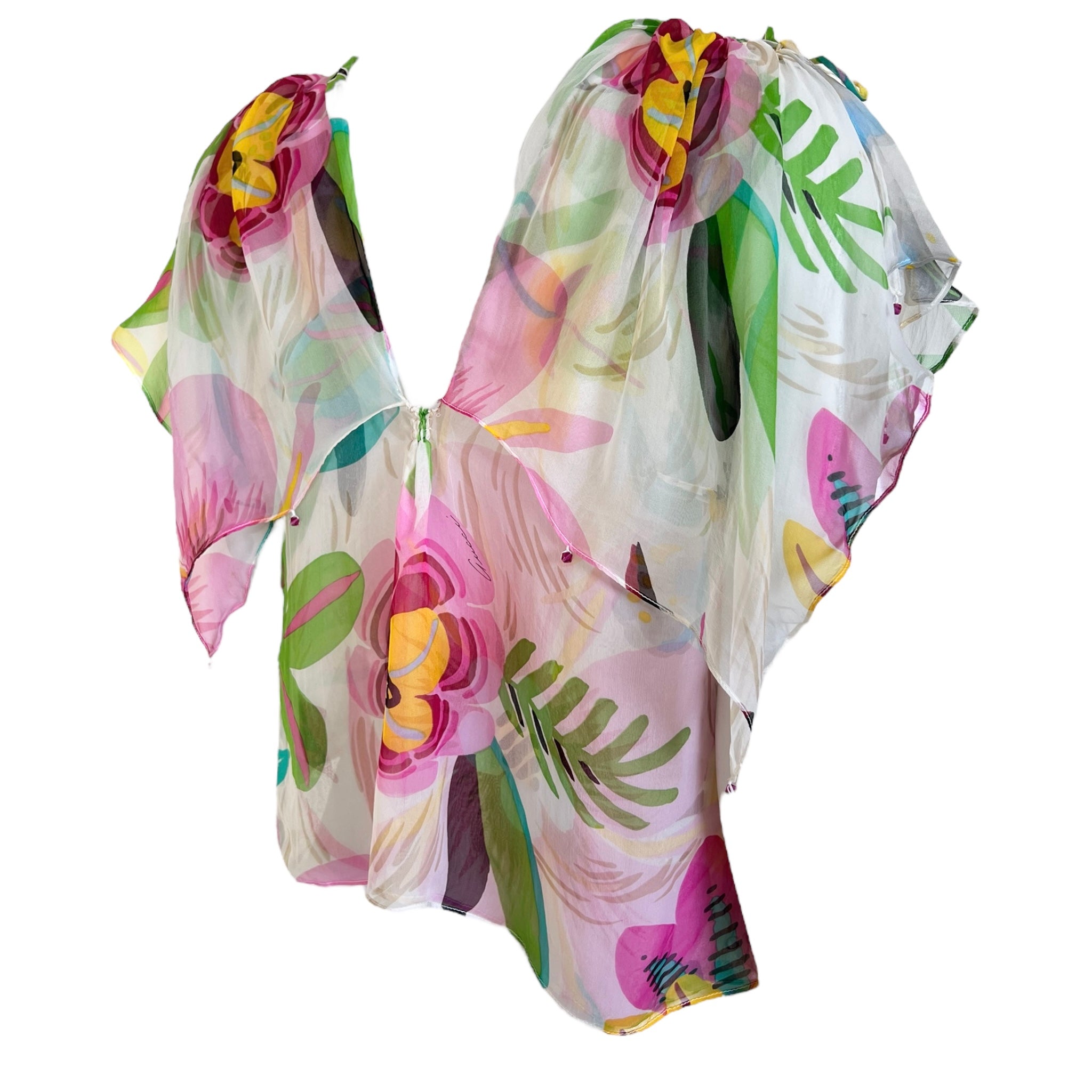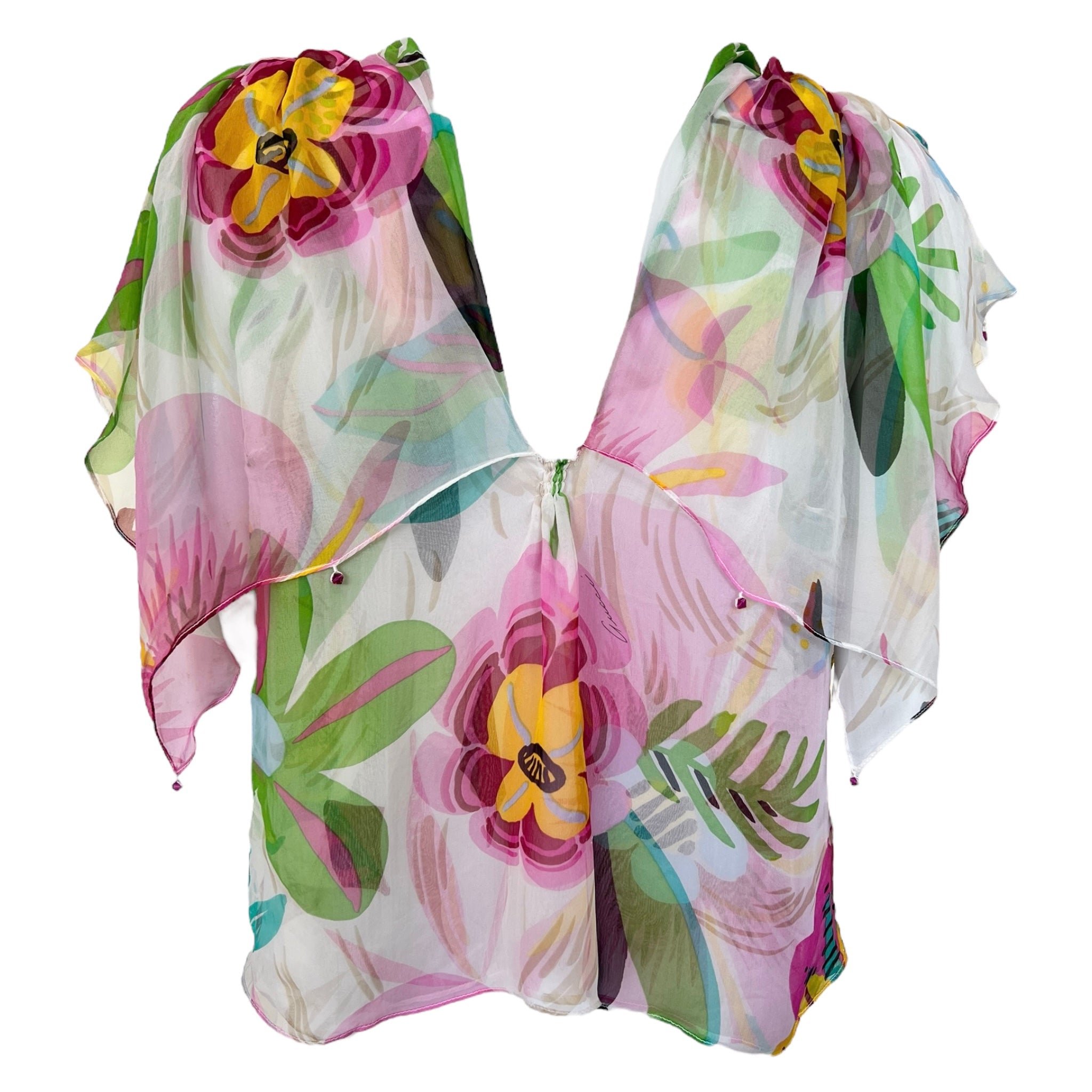 From Tom Ford for Gucci's Spring '99 "Summer of Love" collection. As seen on the runway. White silk with shades of pink, teal, green, yellow, and black in the printed tropical floral motif. Flutter sleeve shoulders with cinch-able ties adorned with pink plastic rhinestone pendants. Peek-a-boo detail down sides punctuated by more pink rhinestones. Unlined, semi-sheer. Instantly recognizable to any Tom Ford for Gucci fanatic.