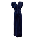 YSL Rive Gauche maxi dress in marine blue "navy" satin-backed crepe—one of the designer's iconic 1980s does 1940s silhouettes. This piece exemplifies Yves Saint Laurent's mastery of channeling Golden Age Hollywood glamour through a contemporary lens. The marine blue hue is quintessentially YSL—sophisticated, timeless, and endlessly chic. Crafted in luxurious satin-backed crepe that drapes beautifully while maintaining structure. Buttons all the way down the front for versatility and visual interest, with ruching detail creating a form-fitting look that flatters and accentuates the silhouette. The shirred puffy wrap short sleeves add a touch of 1940s romance and feminine drama—a signature Saint Laurent move that balances strength with softness. This full-length maxi silhouette embodies the elegant ease of Rive Gauche ready-to-wear at its finest. The combination of structured shoulders, cinched waist, and flowing length creates that perfect Saint Laurent proportion. A museum-worthy example of 1980s YSL that represents the decade's love affair with vintage Hollywood glamour reinterpreted with modern sophistication.