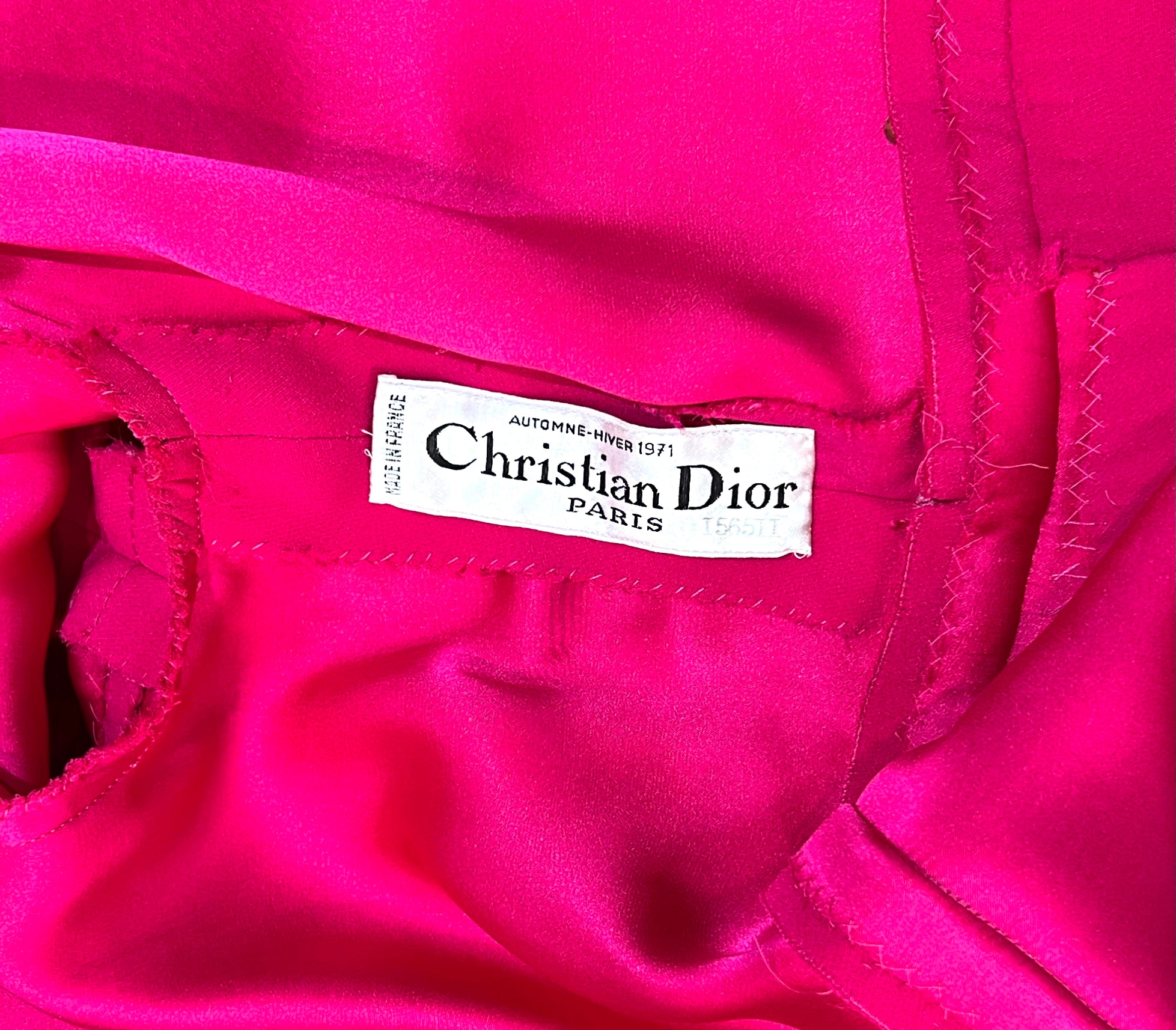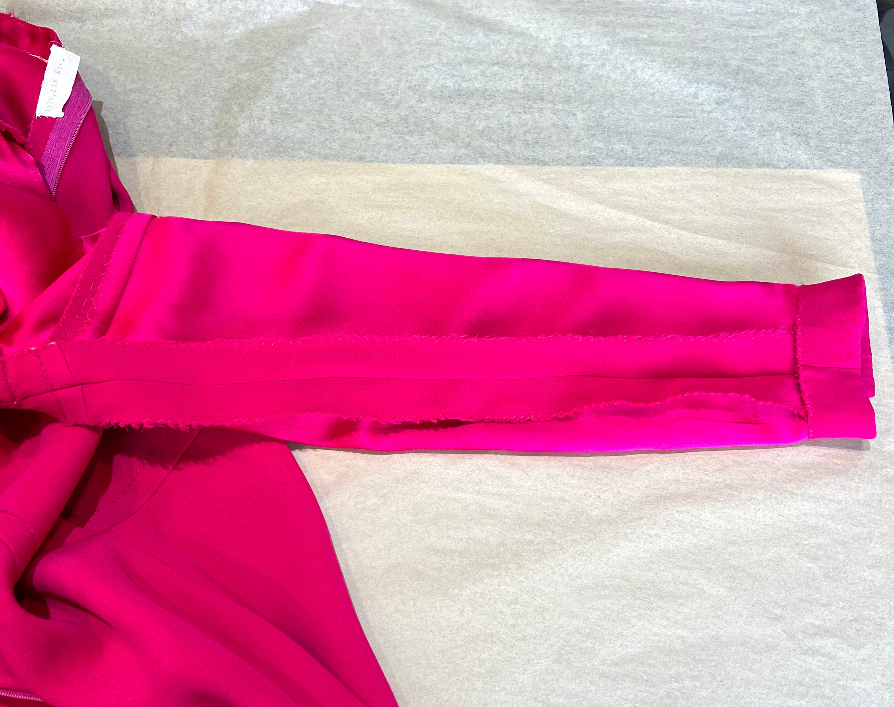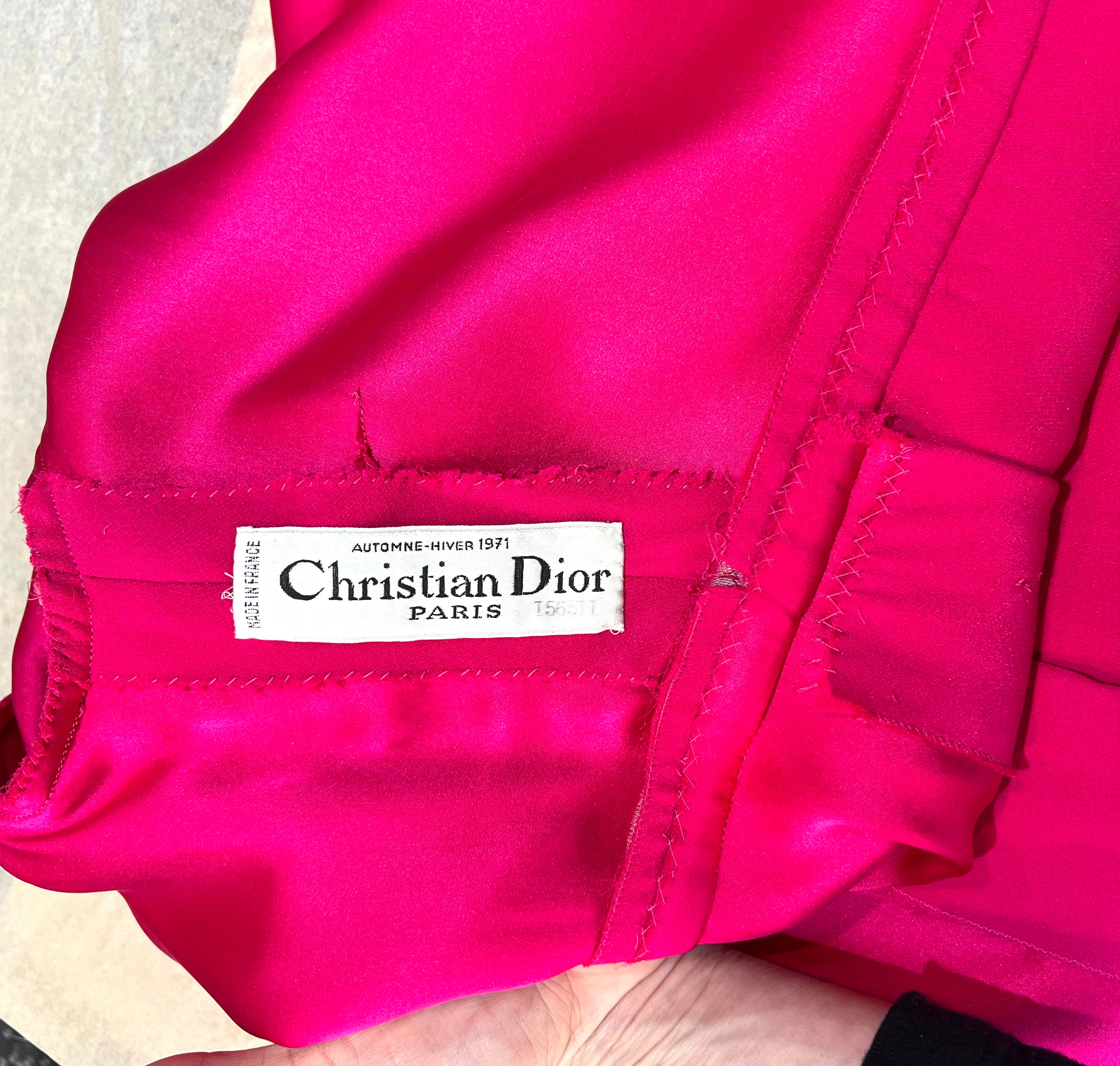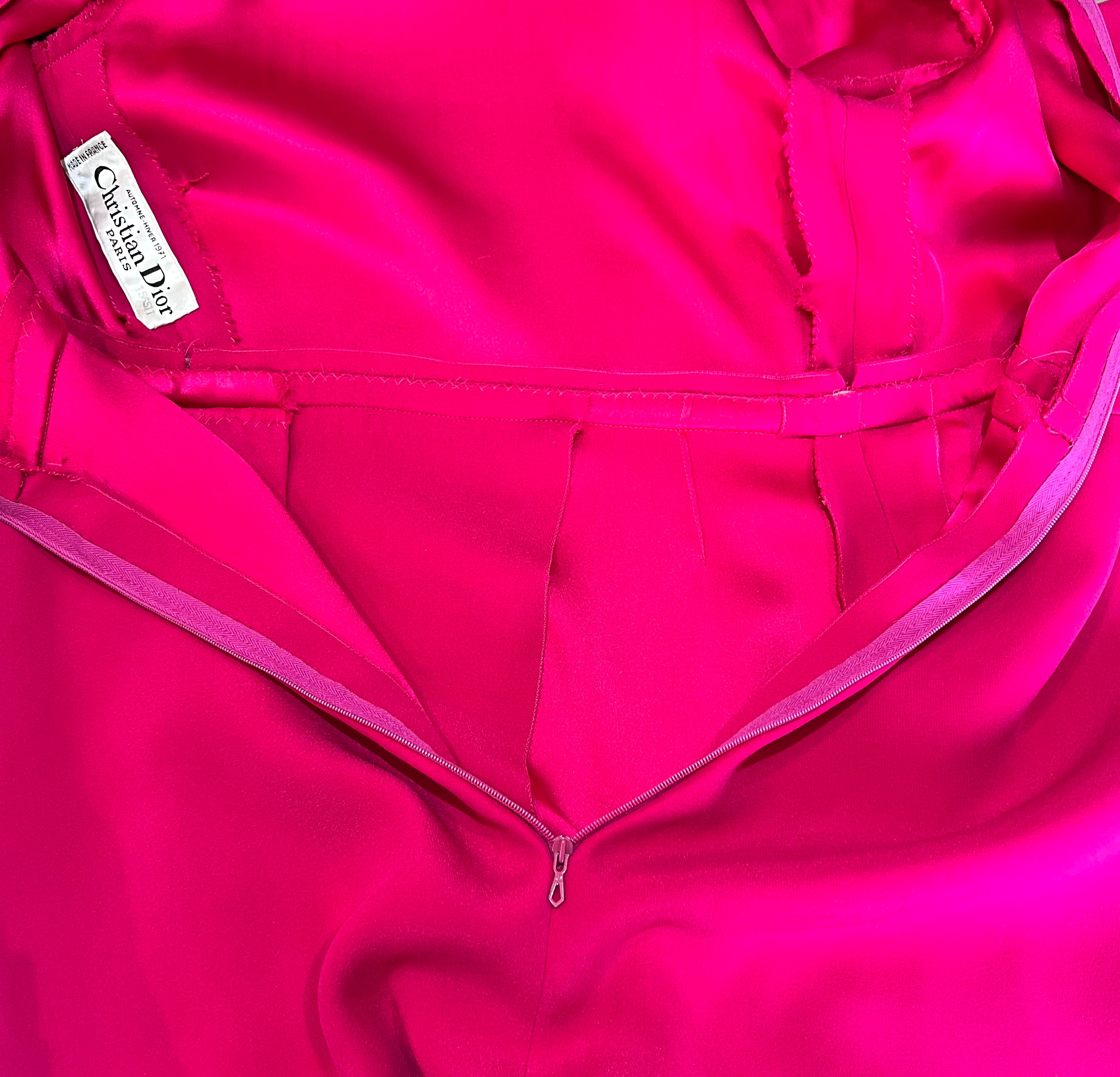马克·博昂 (Marc Bohan) 设计的 Christian Dior 1971 秋冬高级定制服。鲜艳的洋红色丝绸衬托出连衣裙优雅的廓形和精致的剪裁。双袖和左侧腰部以下饰有装饰性包扣。腿部开衩设计营造出左侧纽扣未扣的俏皮效果。外层为斜纹绉绸,内衬为拖鞋丝绸。手工缝制的高级定制工艺。永恒时尚,轻松随意。后背拉链开合。已从博物馆退藏。
