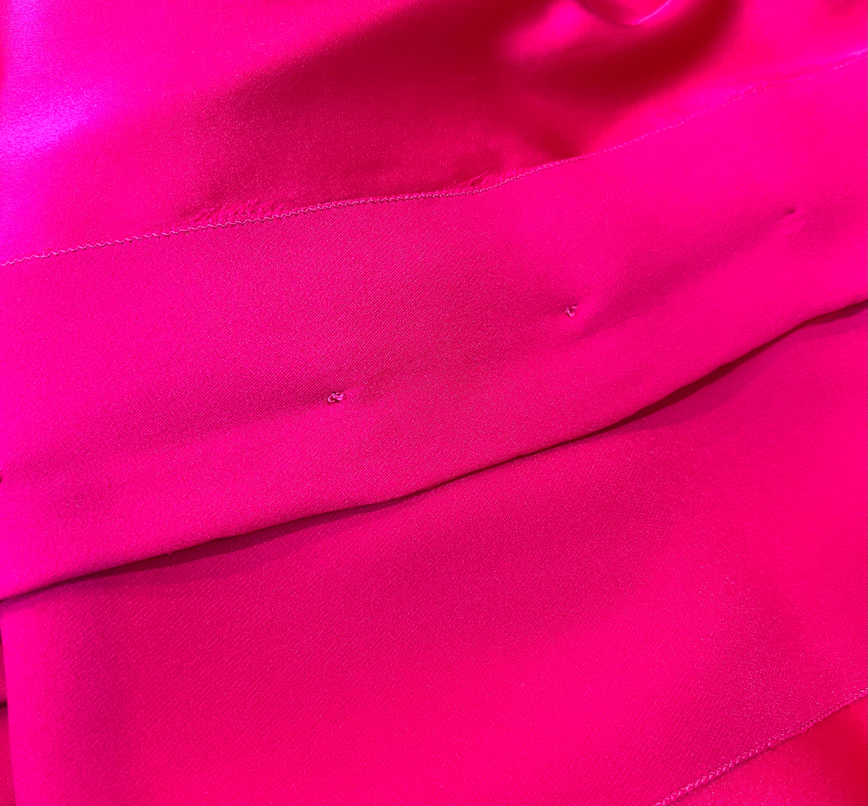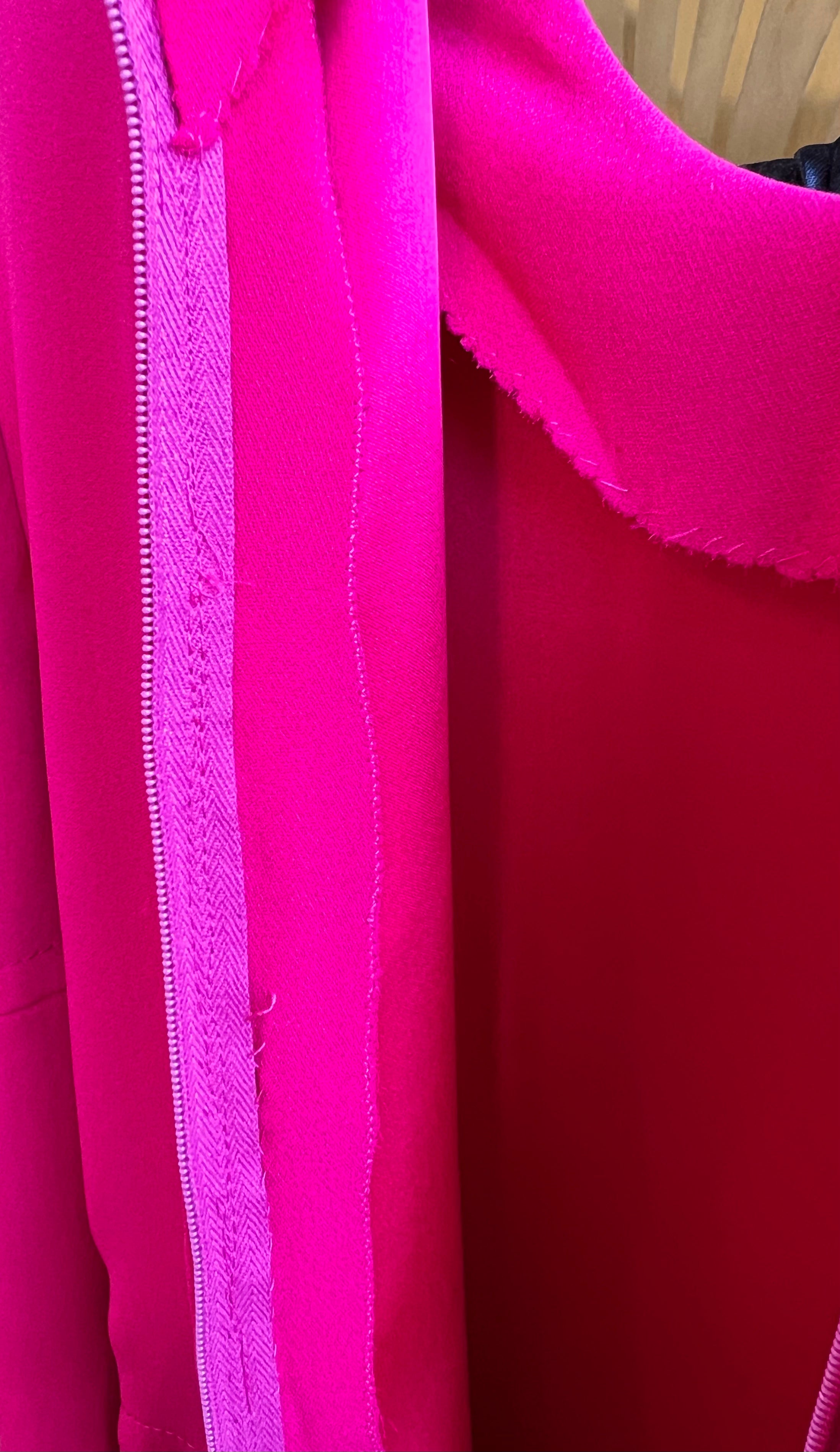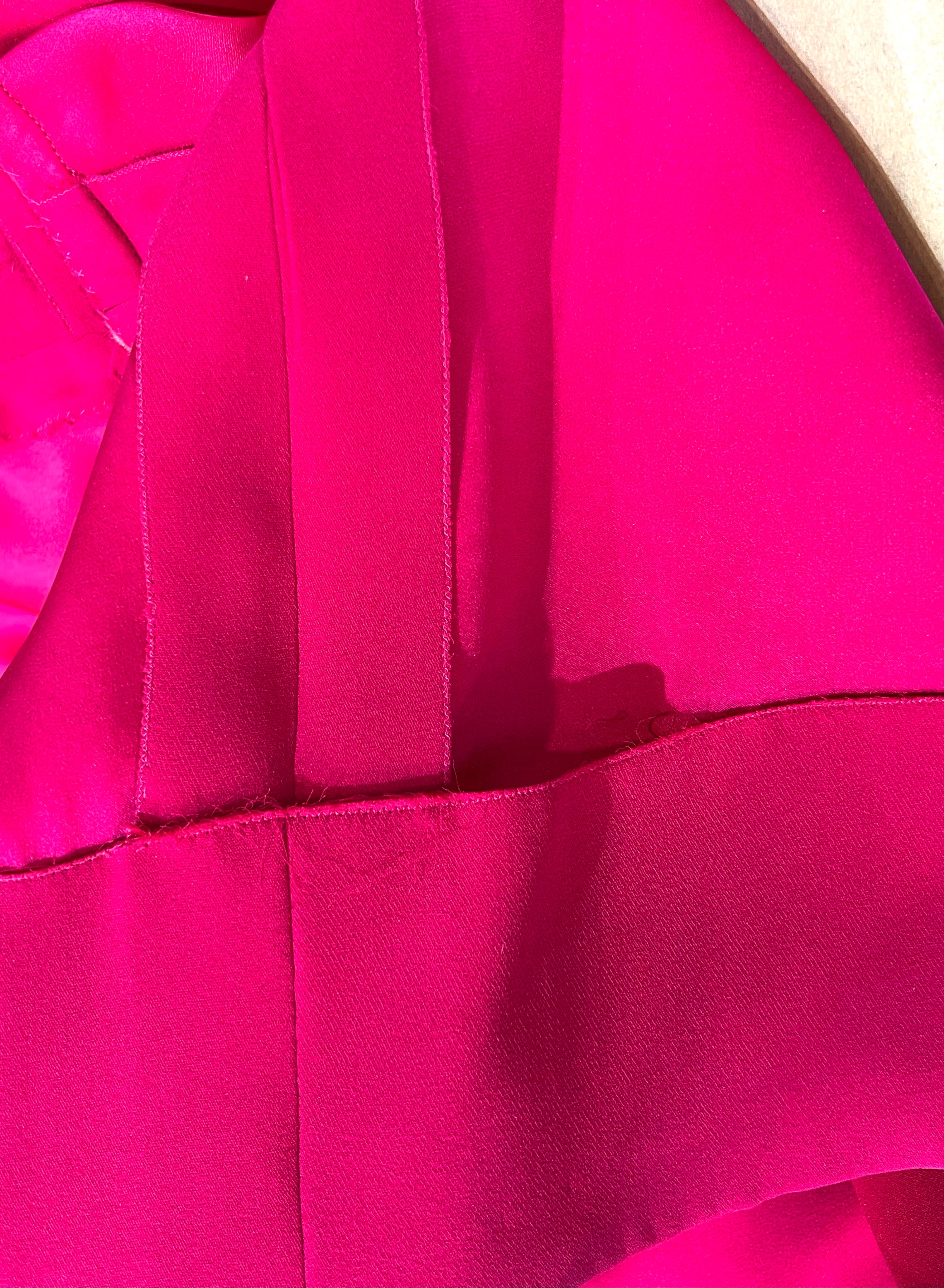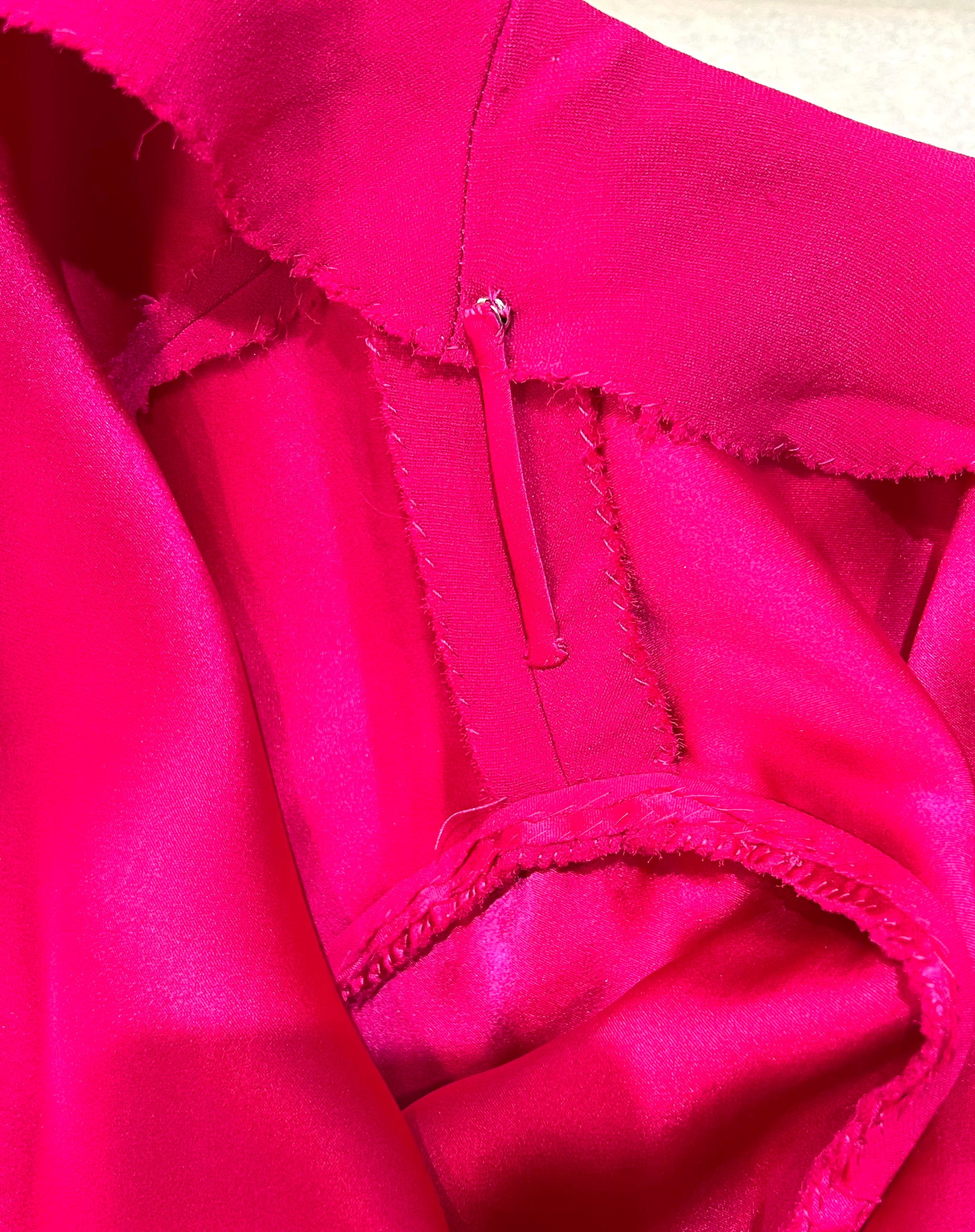 马克·博昂 (Marc Bohan) 设计的 Christian Dior 1971 秋冬高级定制服。鲜艳的洋红色丝绸衬托出连衣裙优雅的廓形和精致的剪裁。双袖和左侧腰部以下饰有装饰性包扣。腿部开衩设计营造出左侧纽扣未扣的俏皮效果。外层为斜纹绉绸,内衬为拖鞋丝绸。手工缝制的高级定制工艺。永恒时尚,轻松随意。后背拉链开合。已从博物馆退藏。