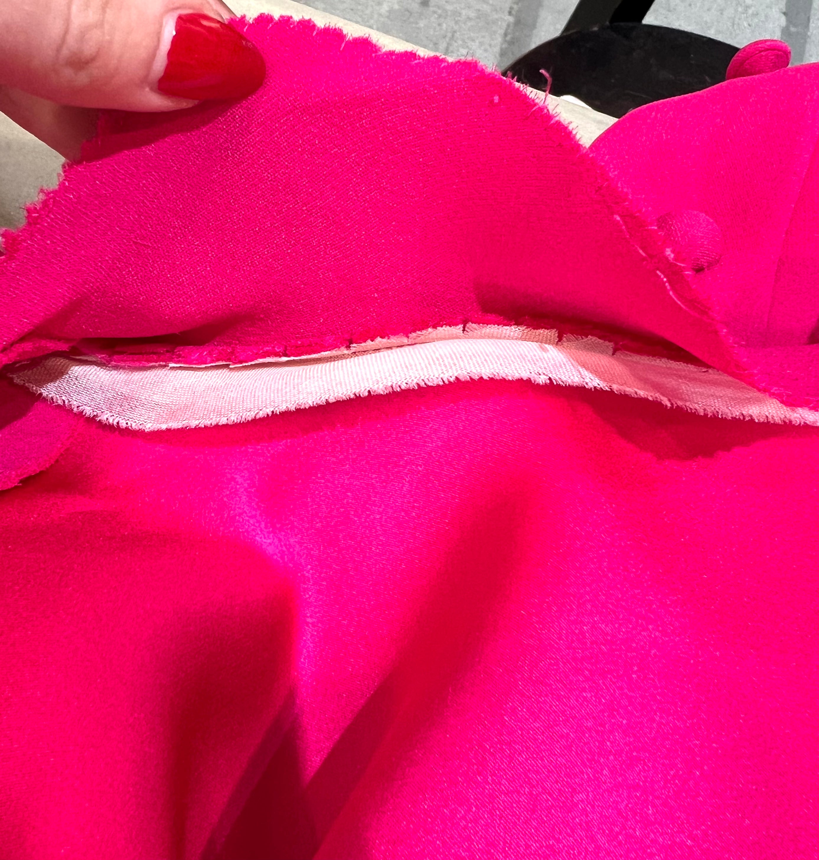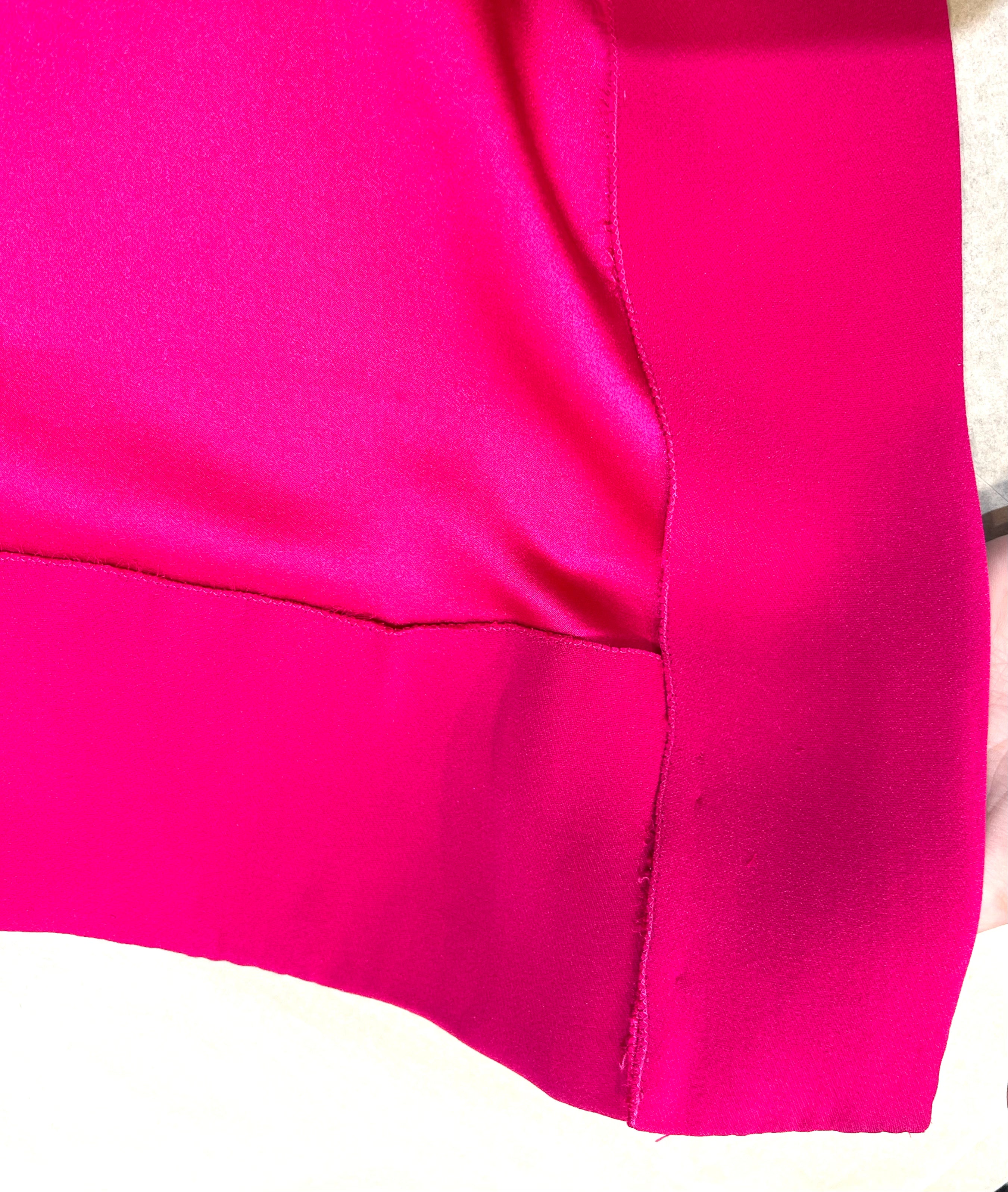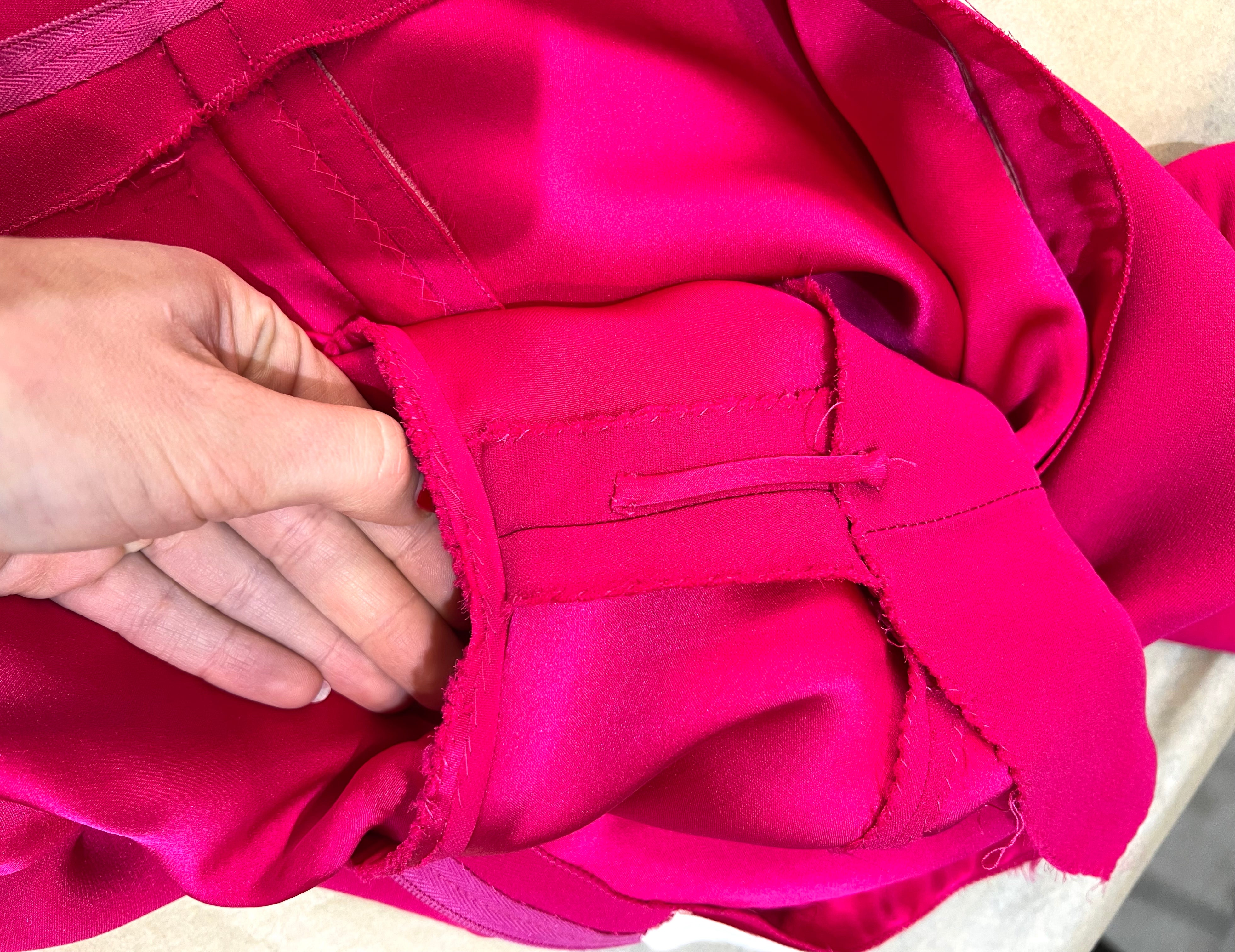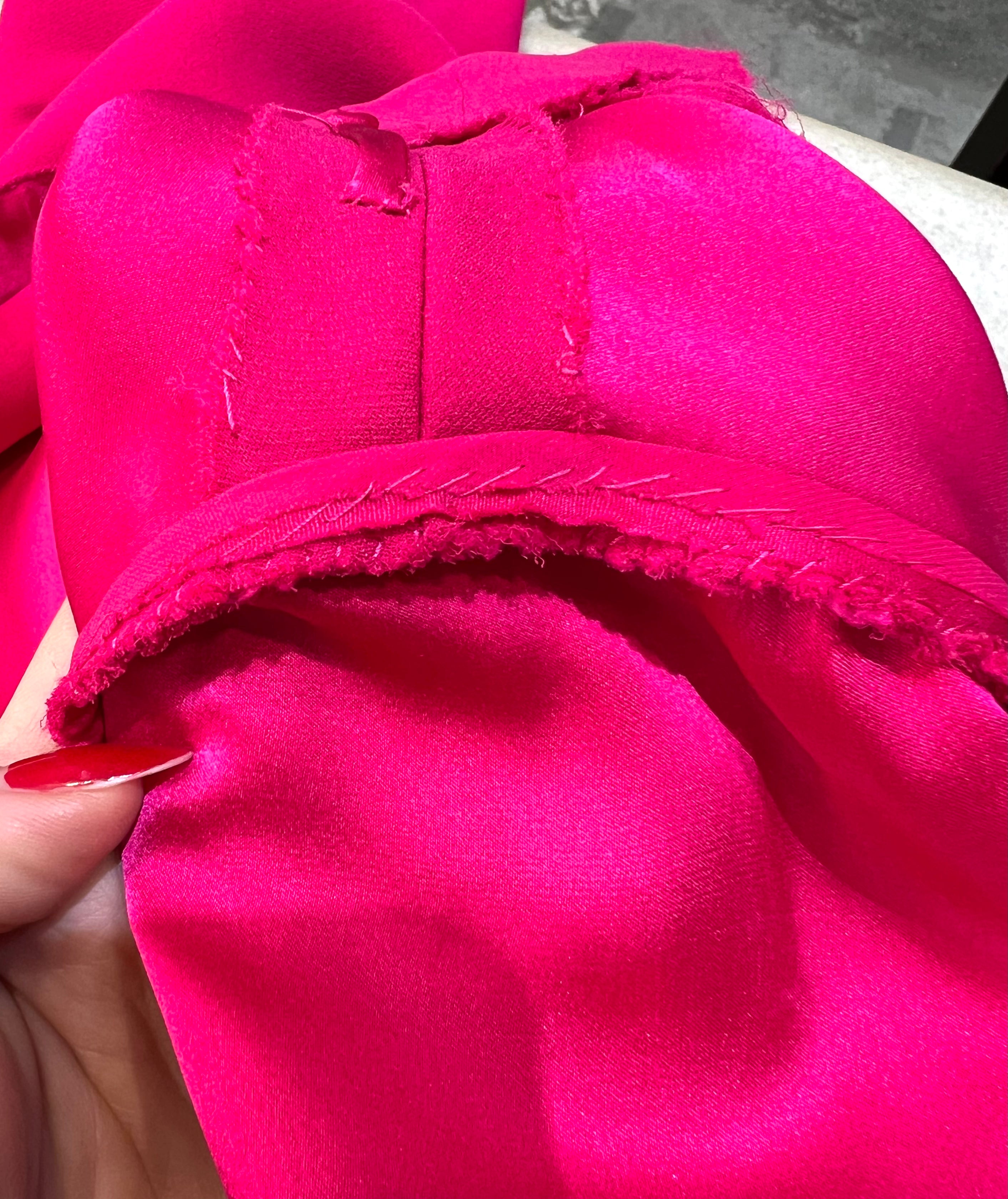 马克·博昂 (Marc Bohan) 设计的 Christian Dior 1971 秋冬高级定制服。鲜艳的洋红色丝绸衬托出连衣裙优雅的廓形和精致的剪裁。双袖和左侧腰部以下饰有装饰性包扣。腿部开衩设计营造出左侧纽扣未扣的俏皮效果。外层为斜纹绉绸,内衬为拖鞋丝绸。手工缝制的高级定制工艺。永恒时尚,轻松随意。后背拉链开合。已从博物馆退藏。
