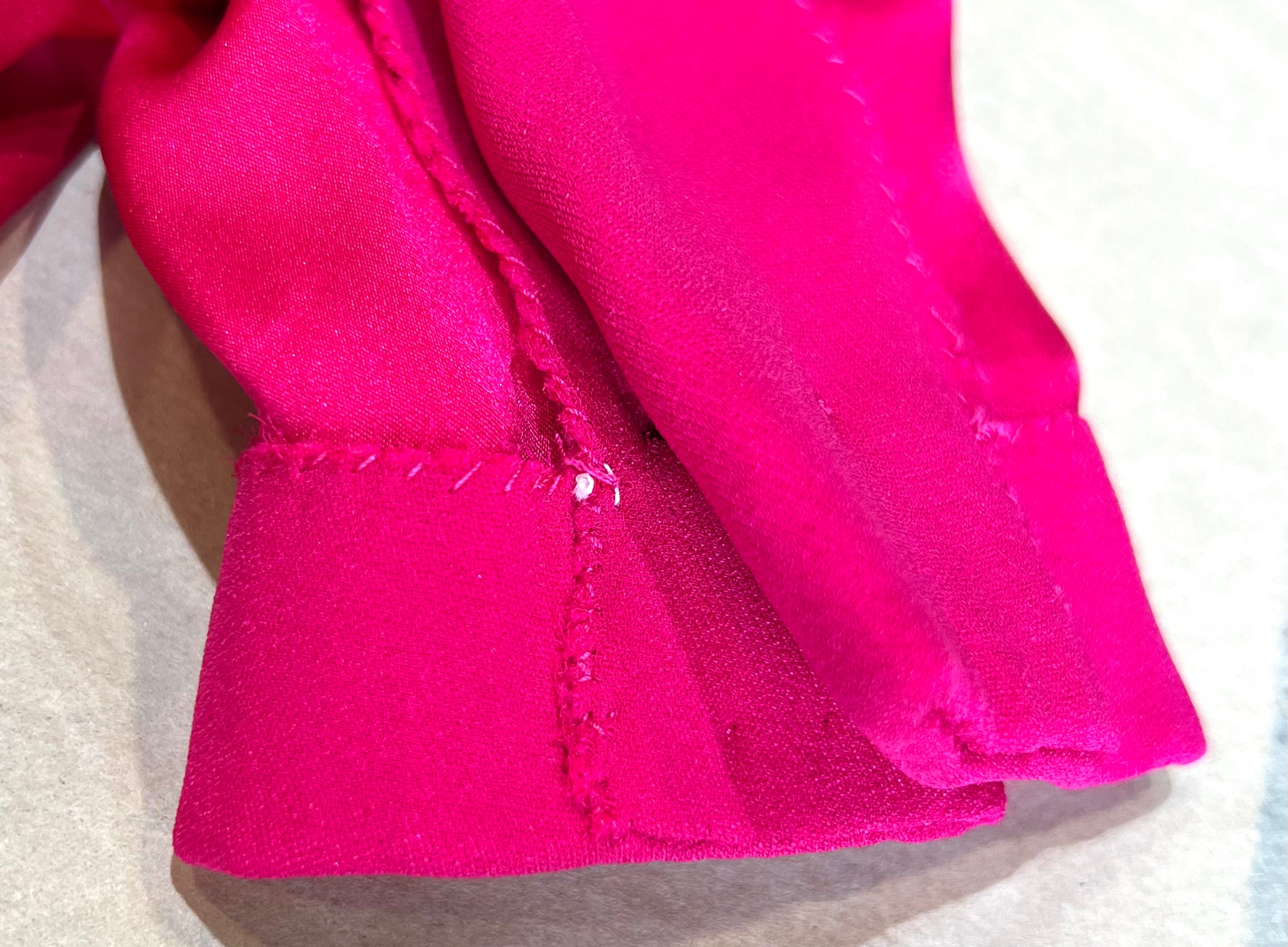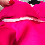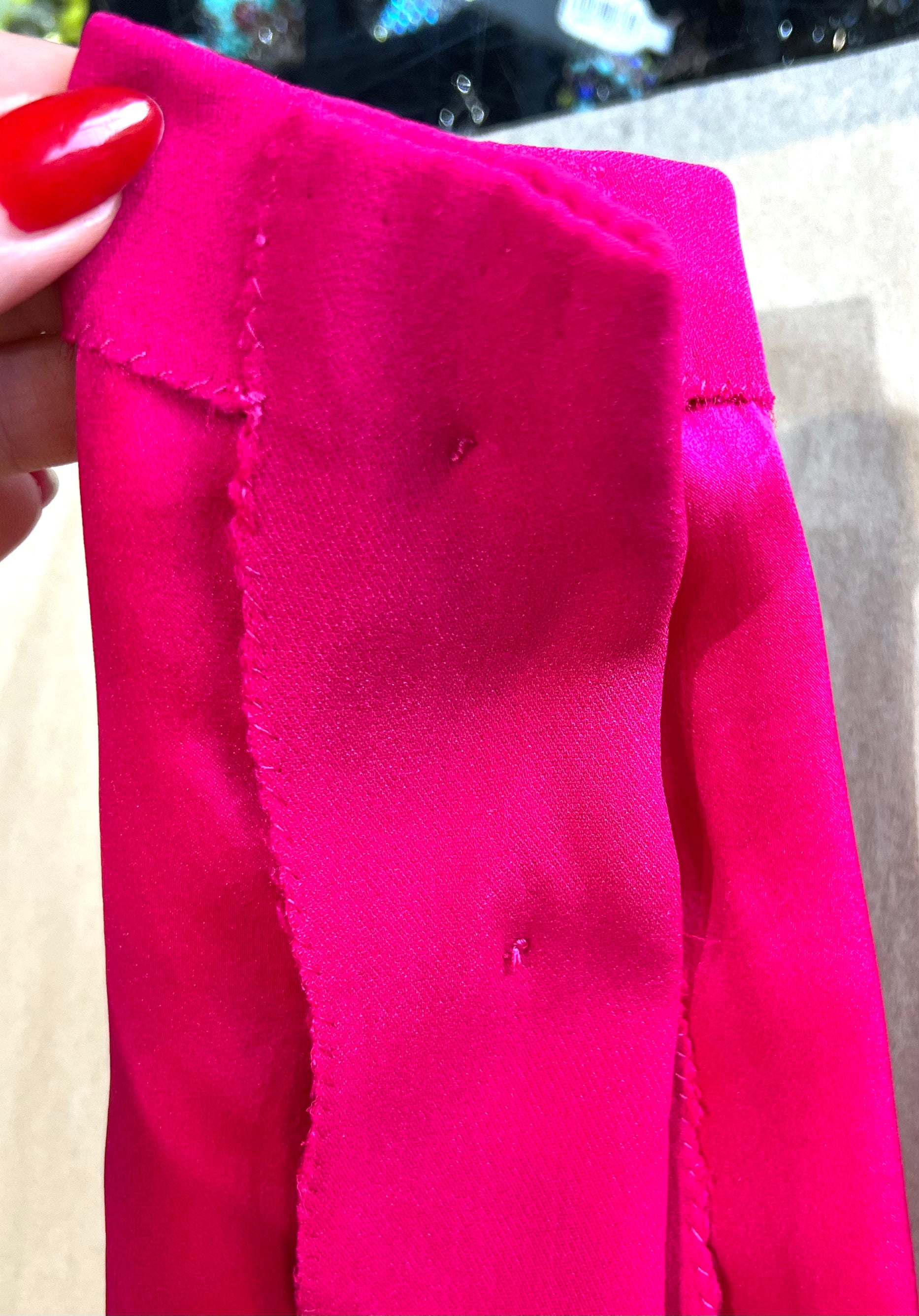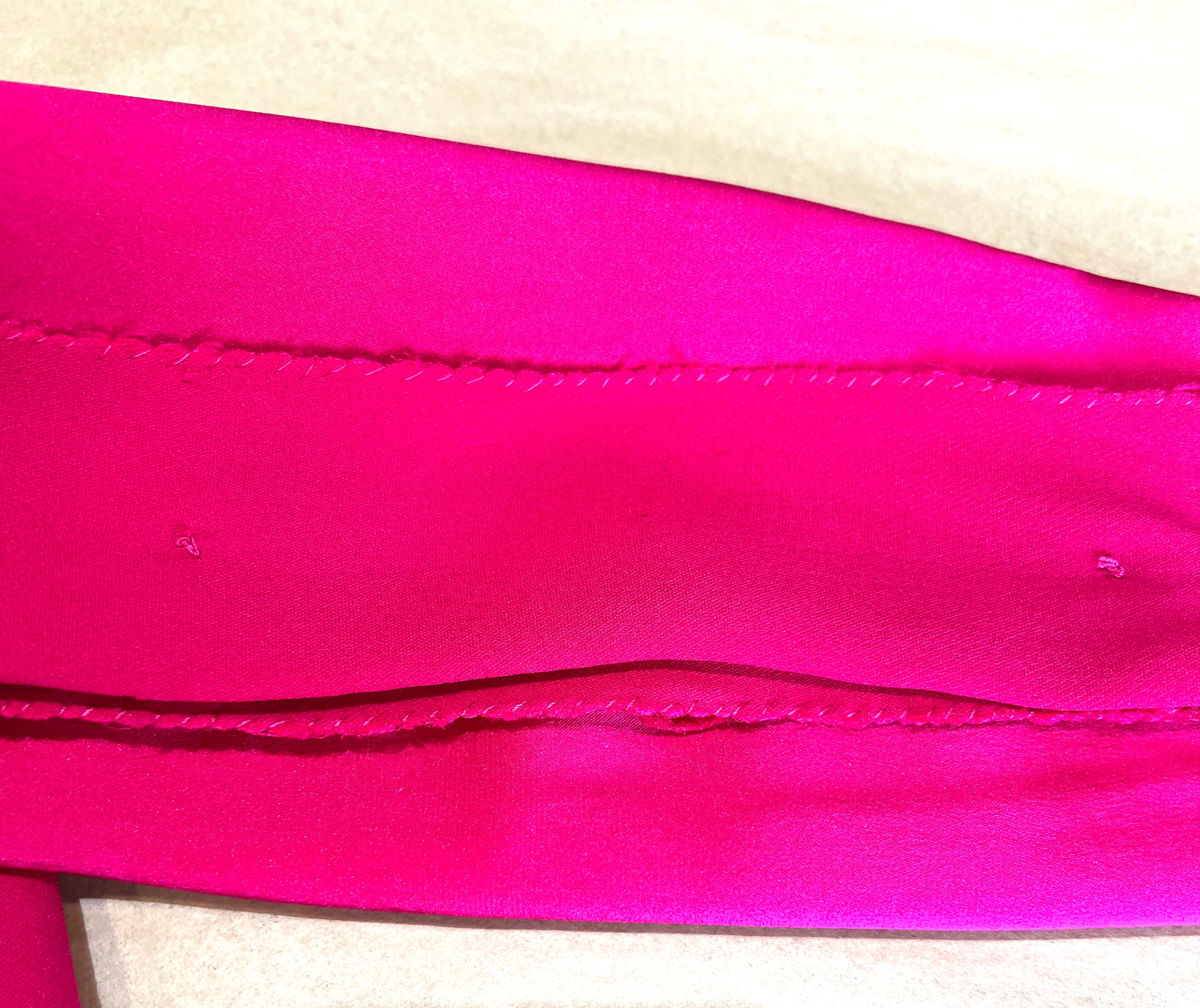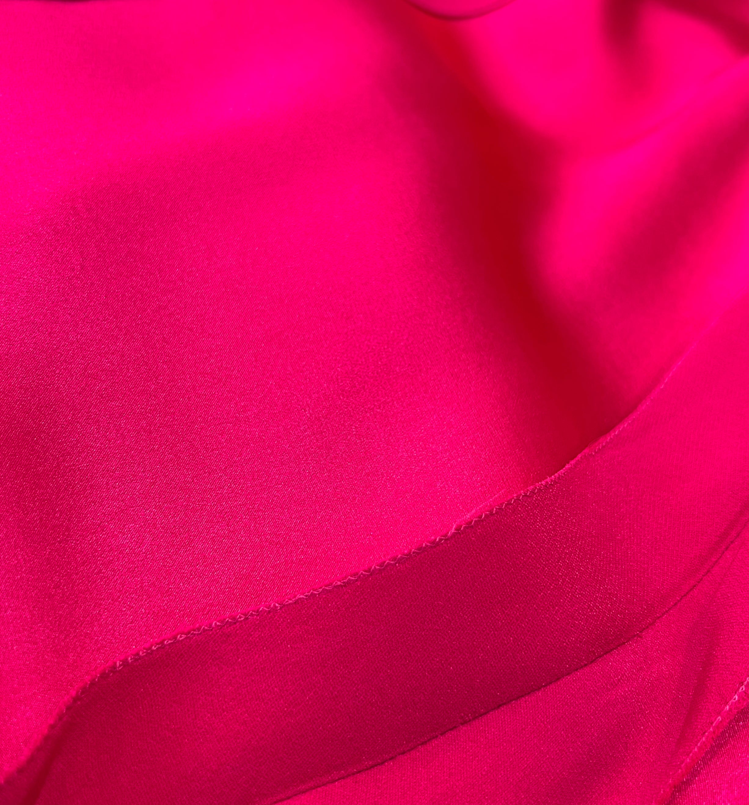 马克·博昂 (Marc Bohan) 设计的 Christian Dior 1971 秋冬高级定制服。鲜艳的洋红色丝绸衬托出连衣裙优雅的廓形和精致的剪裁。双袖和左侧腰部以下饰有装饰性包扣。腿部开衩设计营造出左侧纽扣未扣的俏皮效果。外层为斜纹绉绸,内衬为拖鞋丝绸。手工缝制的高级定制工艺。永恒时尚,轻松随意。后背拉链开合。已从博物馆退藏。