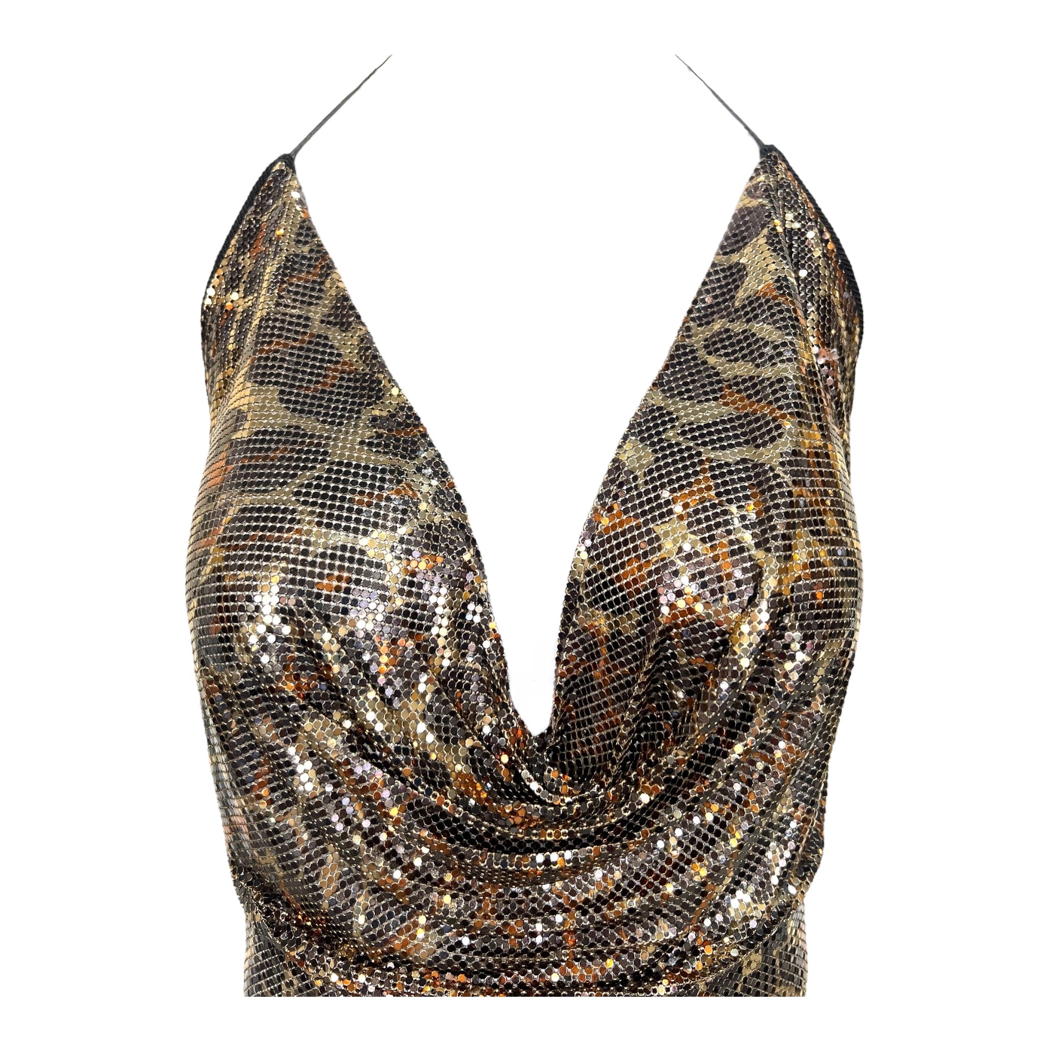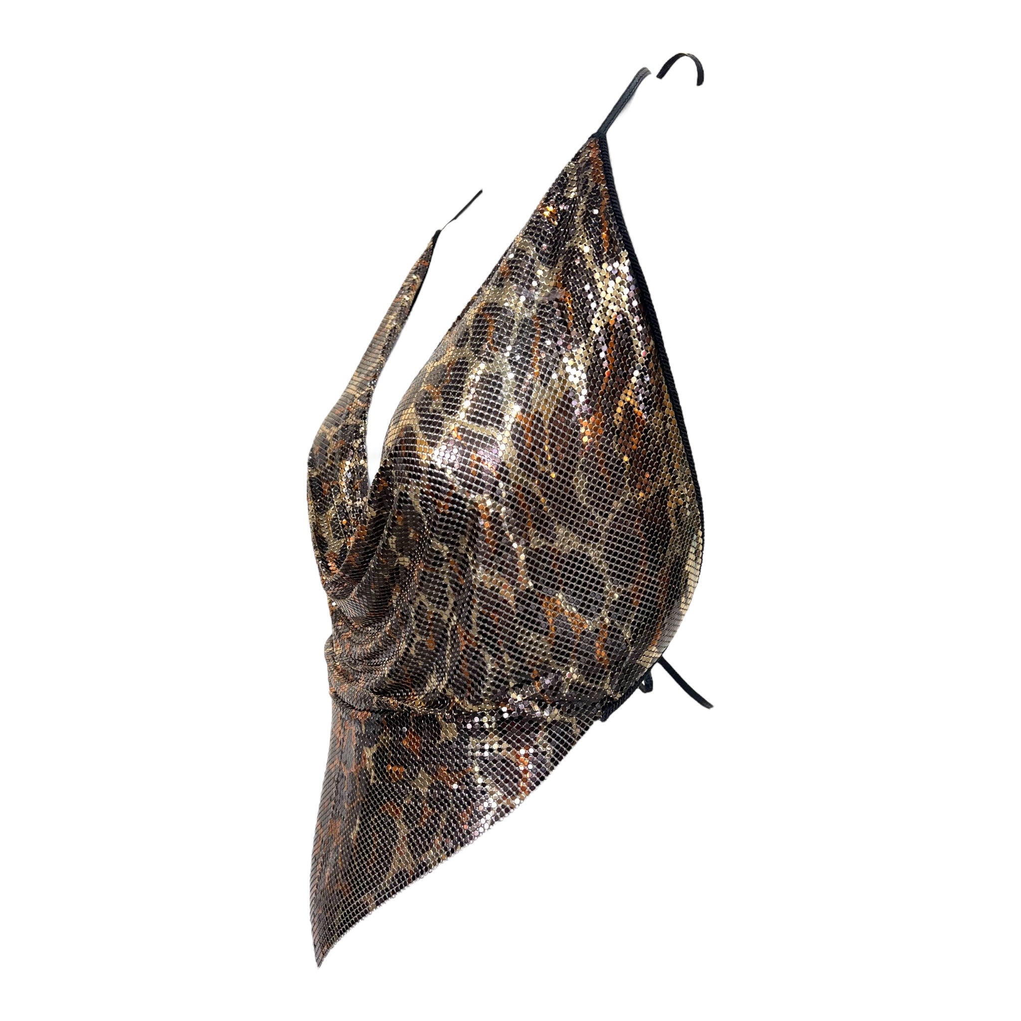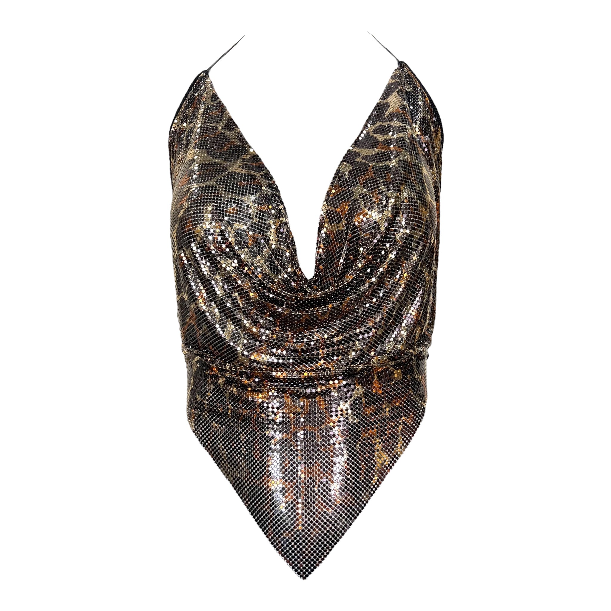 这款性感的豹纹印花珐琅金属网露背上衣出自设计师 Anthony Ferrara 的个人收藏,是野性优雅与工业奢华的完美结合。迷人的豹纹图案采用温暖的古铜色,将冰冷的金属网变成一幅凶猛美丽的画布,通过精湛的工艺引导野性的原始力量。流畅的网眼结构优雅地垂坠入低胸围领,紧贴身体,呈现出 Ferrara 标志性的尖头手帕轮廓,而戏剧性的露背设计则放大了性感的魅力。颈部和背部配有黑色皮革系带,可调节款式,侧面精心放置的毛毡面板更加舒适。这款来自设计师个人收藏的档案作品代表了动物磁性和前卫设计的完美融合,创造出既颂扬女性力量又颂扬野性之美的可穿戴艺术。