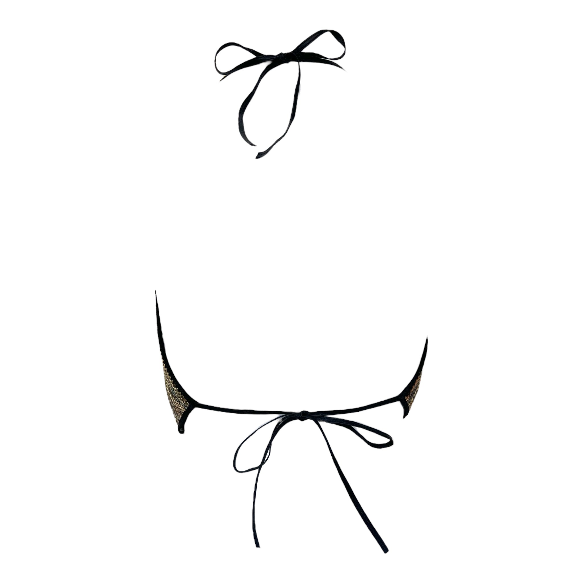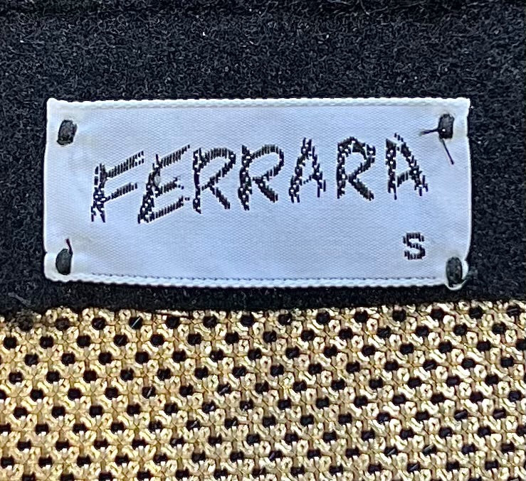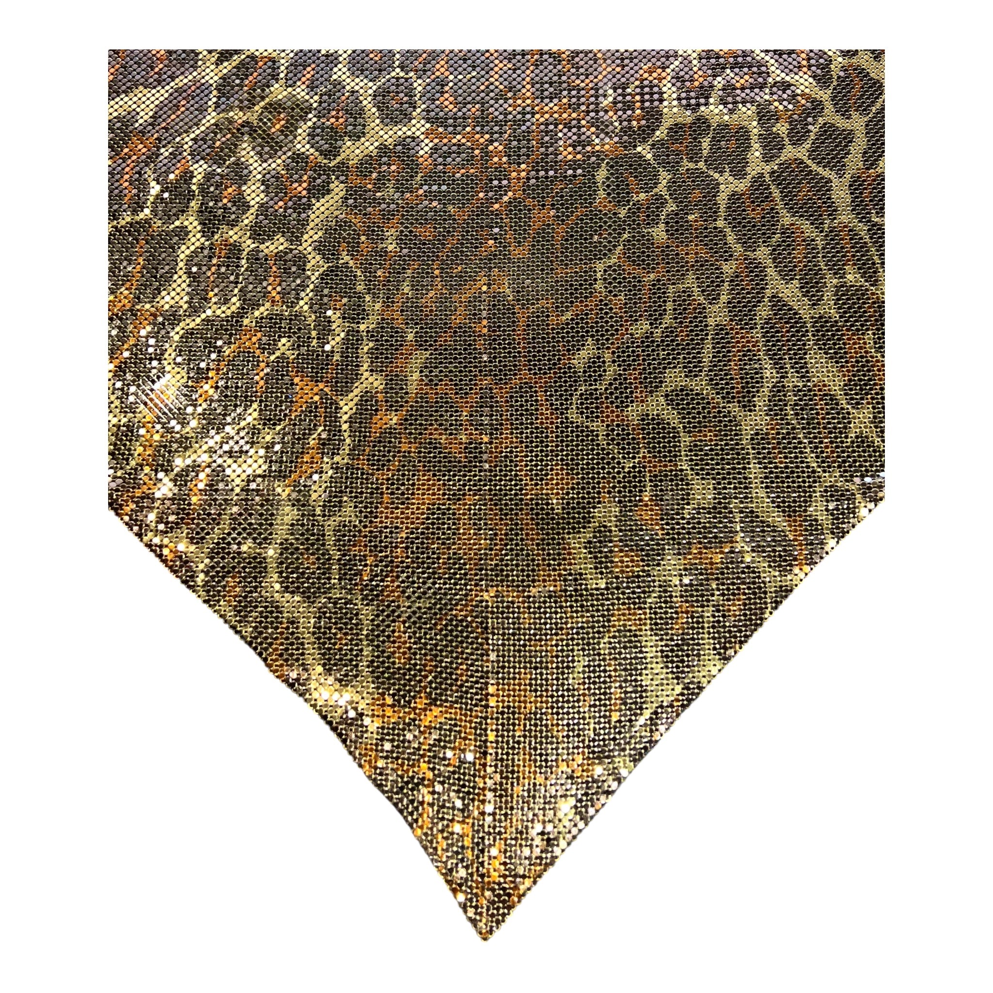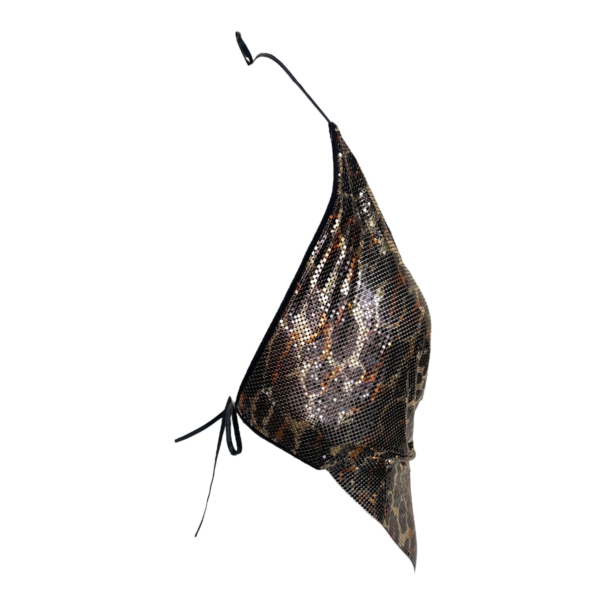 这款性感的豹纹印花珐琅金属网露背上衣出自设计师 Anthony Ferrara 的个人收藏,是野性优雅与工业奢华的完美结合。迷人的豹纹图案采用温暖的古铜色,将冰冷的金属网变成一幅凶猛美丽的画布,通过精湛的工艺引导野性的原始力量。流畅的网眼结构优雅地垂坠入低胸围领,紧贴身体,呈现出 Ferrara 标志性的尖头手帕轮廓,而戏剧性的露背设计则放大了性感的魅力。颈部和背部配有黑色皮革系带,可调节款式,侧面精心放置的毛毡面板更加舒适。这款来自设计师个人收藏的档案作品代表了动物磁性和前卫设计的完美融合,创造出既颂扬女性力量又颂扬野性之美的可穿戴艺术。