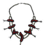金属丝串成的中世纪纳瓦霍族旧典当银南瓜花项链。镶嵌大型天然珊瑚。品相极佳,包浆雅致。